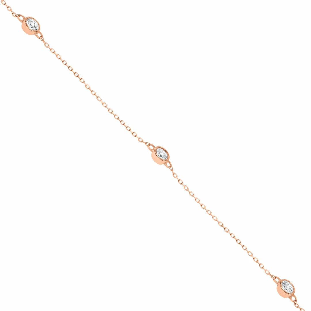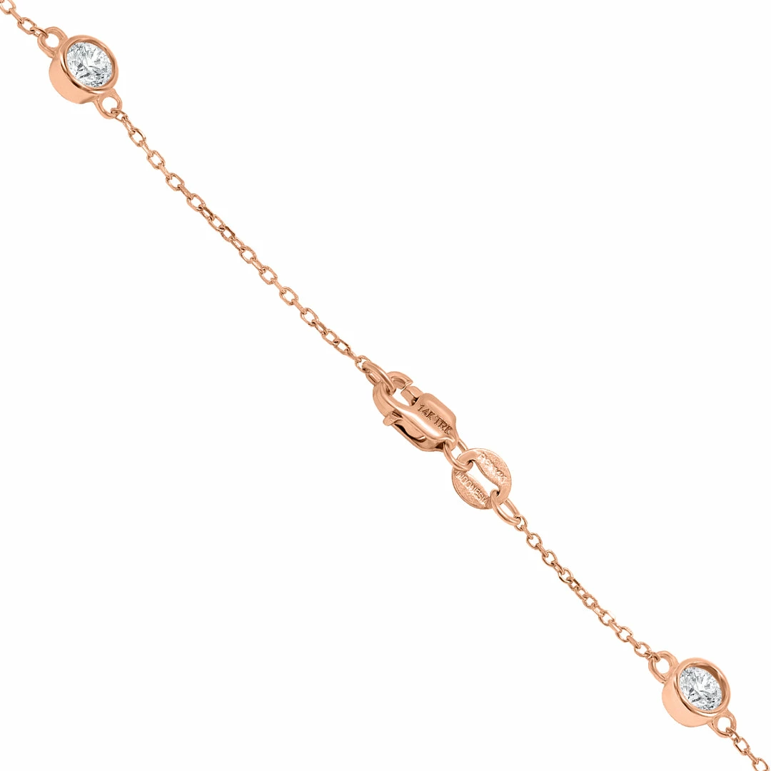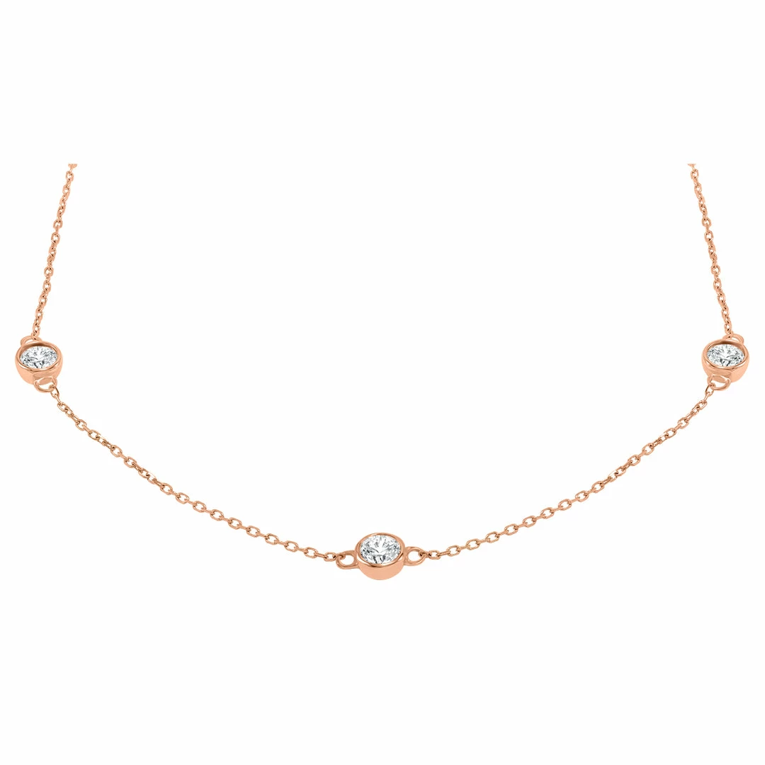 A very stylish and popular diamond station necklace featuring 10 genuine bezel set diamonds weighing 1 1/2 carat total weight on a 14K rose gold chain. The 0.80mm gauge cable chain creates a cool, easy wear look perfect for today’s dainty fast fashion styles. The necklace secures with a durable lobster claw clasp. The necklace measures 18 inches in length.