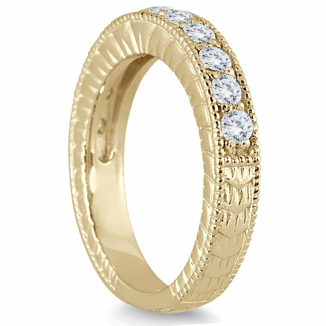 A 1/2 carat total weight diamond band set in 10K yellow gold. 11 diamonds in total are prong set on this antique inspired engraved wedding band. A beautiful band great if worn alone or alongside an engagement ring. Detailed workmanship and hand matched and set diamonds combine to create a stunning ring sure to be treasured forever.
