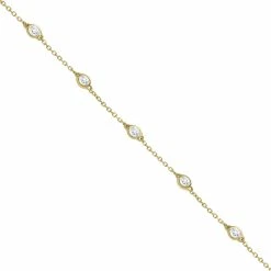 A very stylish and popular diamond station bracelet featuring 10 genuine bezel set diamonds weighing 1/2 carat total weight on a 14K yellow gold chain. The 0.80mm gage cable chain creates a cool, easy wear look perfect for todays dainty fast fashion styles. The bracelet secures with a durable lobster claw clasp. The bracelet measuring 7 inches in length.