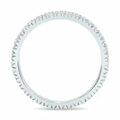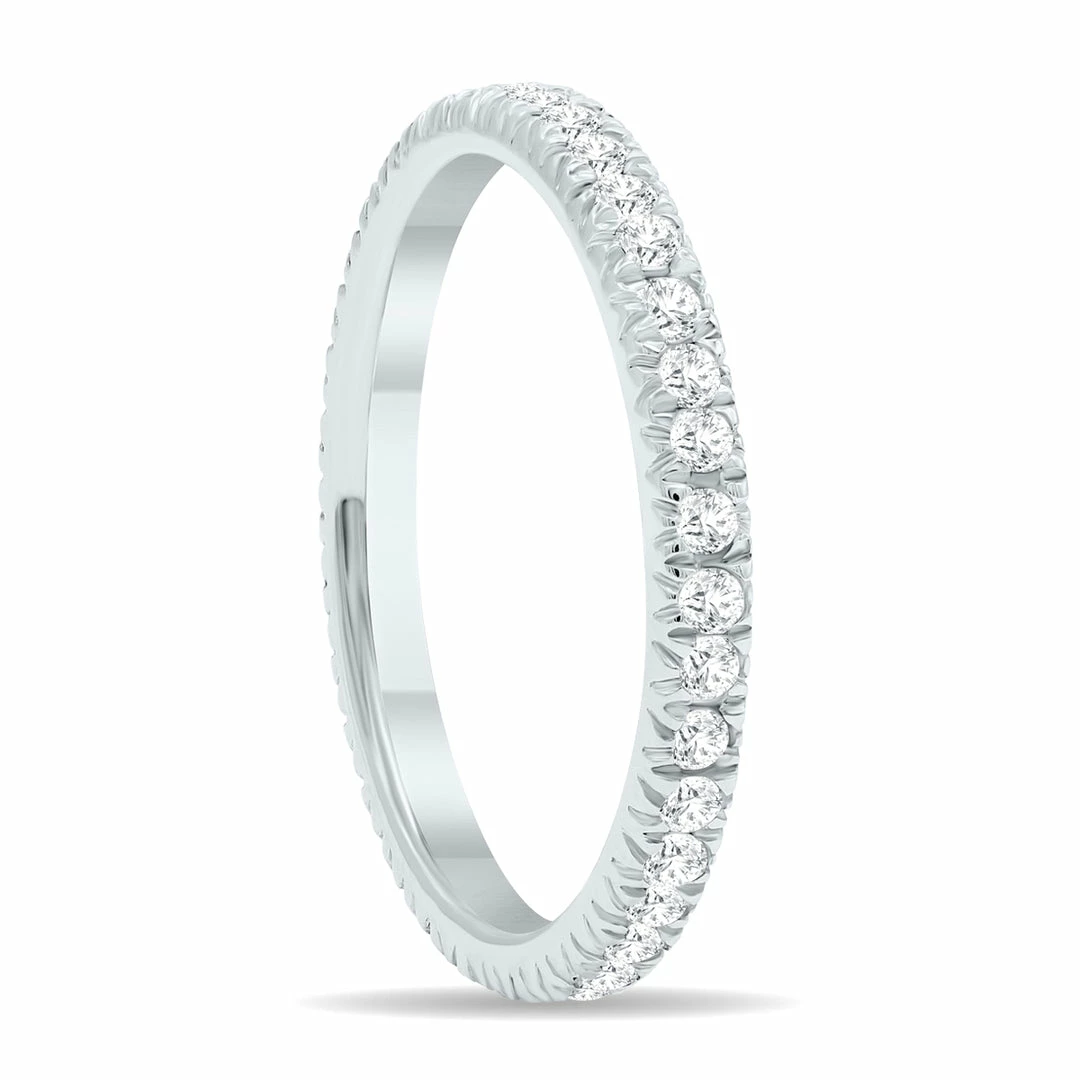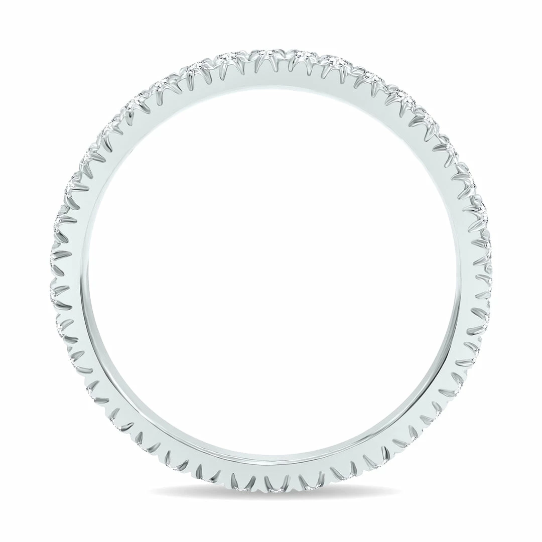 A lovely diamond eternity wedding band crafted in 10K white gold and featuring (35-46) sparkling white diamonds with a minimum total weight of 1/2 carat. The number of diamonds and total diamond weight vary due to ring size with a minimum of 1/2 carat total weight on all rings. An absolutely perfect prong set all the way around diamond eternity band great for everyday wear.