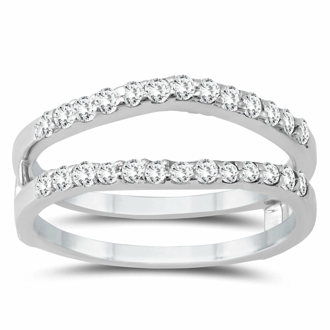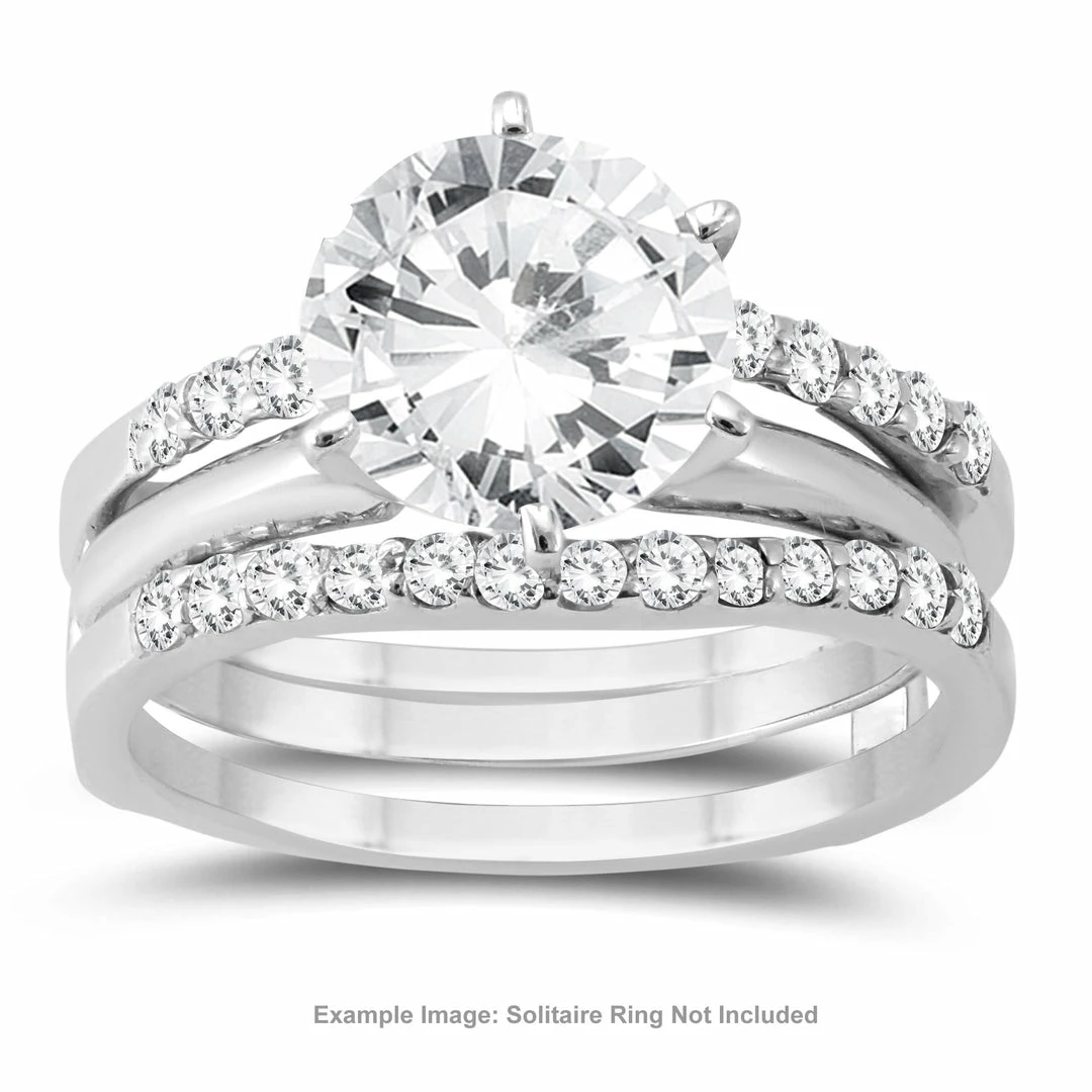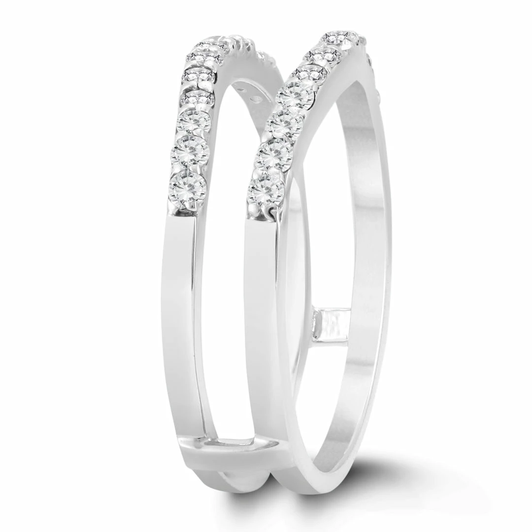 A beautiful diamond insert ring crafted in 14K white gold. The ring is designed so that an engagement ring can be placed in the middle. When worn with a center ring, diamonds will flank both sides.