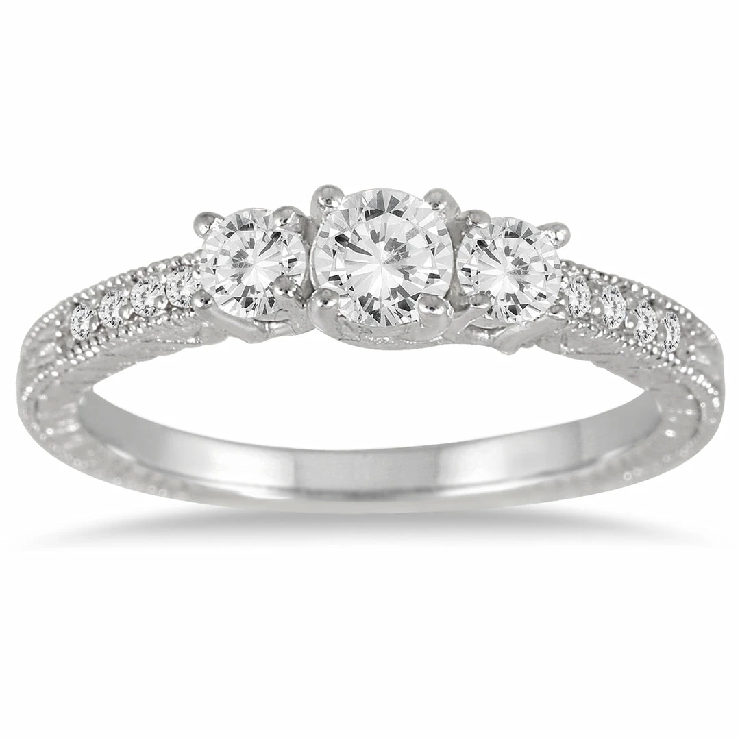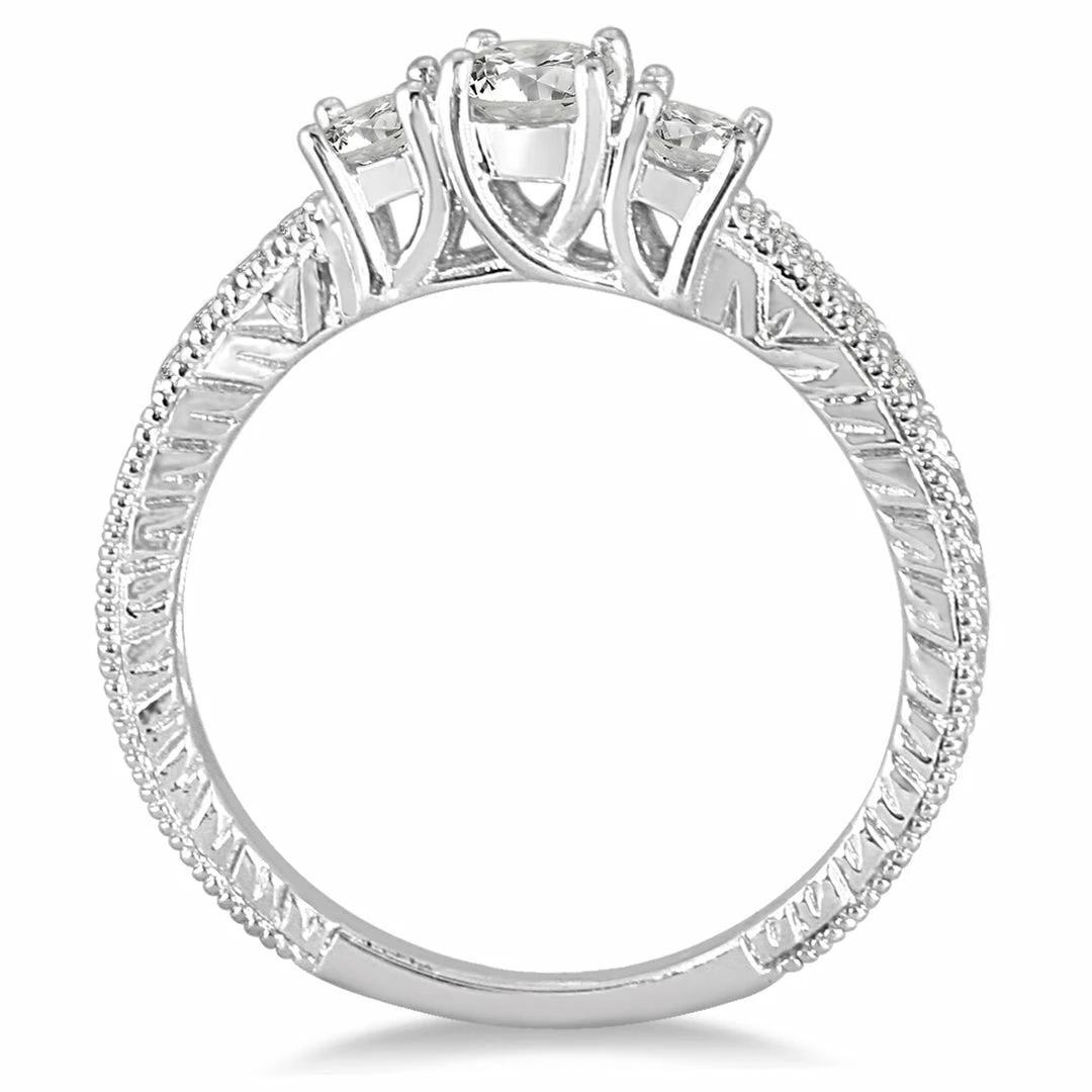 A classic 10K white gold three stone ring featuring prong set side diamonds. The diamonds weigh 1/2 carat total weight. The ring features detailed engraving and bead work.