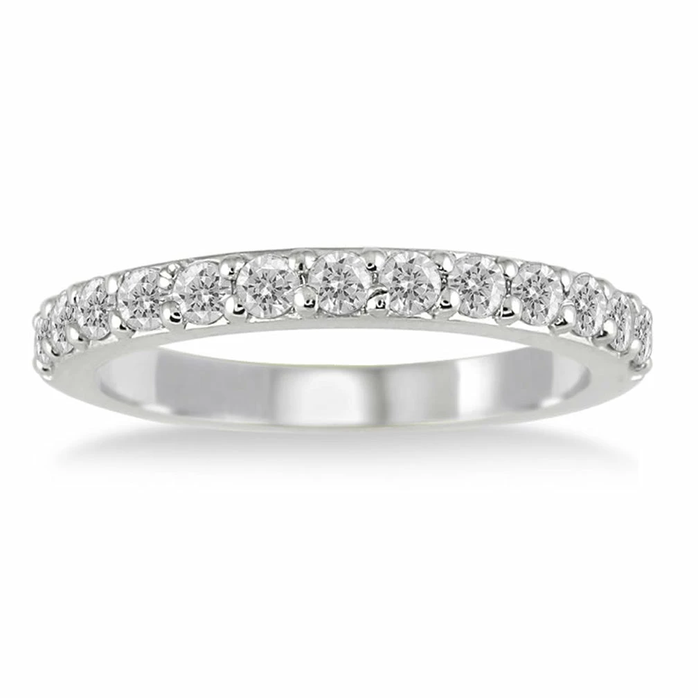 A beautiful prong set wedding band featuring 13 sparkling white diamonds weighing a total of .52 carats. Each stone weighs .04 carat . A beautifully band featuring hand selected stones with excellent sparkle. A classic, simple piece sure to be treasured forever. The ring is crafted in 10K white gold.