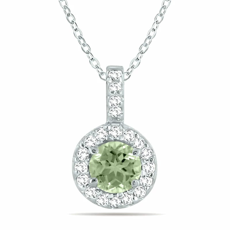 A beautiful 4MM green amethyst round center diamond is surrounded by 20 sparkling white diamonds and set in this 10K white gold halo setting. A very stylish piece great for formal and casual wear. A simple, yet classic piece sure to be cherished. The pendant hangs from an 18 inch chain also crafted in 10K white gold. The diamonds are hand matched and set for a fiery white brilliance with no visible inclusions.