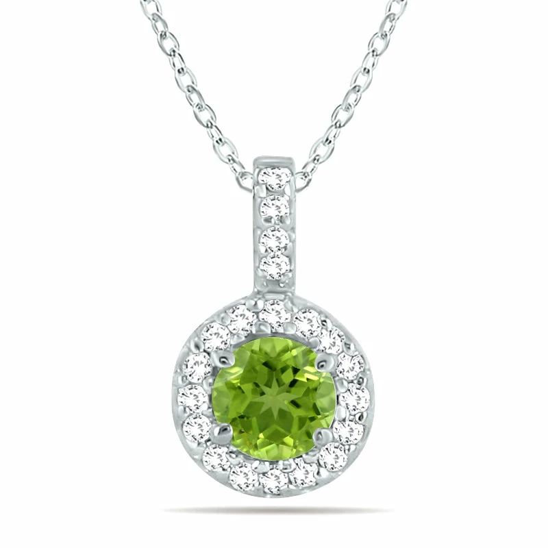 A beautiful 4MM peridot round center diamond is surrounded by 20 sparkling white diamonds and set in this 10K white gold halo setting. A very stylish piece great for formal and casual wear. A simple, yet classic piece sure to be cherished. The pendant hangs from an 18 inch chain also crafted in 10K white gold. The diamonds are hand matched and set for a fiery white brilliance with no visible inclusions.