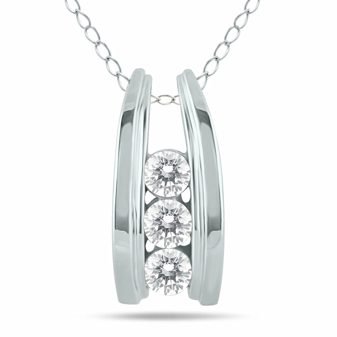 A beautiful three stone pendant crafted in 10K white gold. Diamonds weigh a total of 1/2 carat. Symbolizing your past, present, and future, this 3 stone pendant features a unique setting design that is sure to be treasured forever. A great value for a 1/2 carat tw 3 stone pendant in a beautiful setting style crafted in 10K white gold.