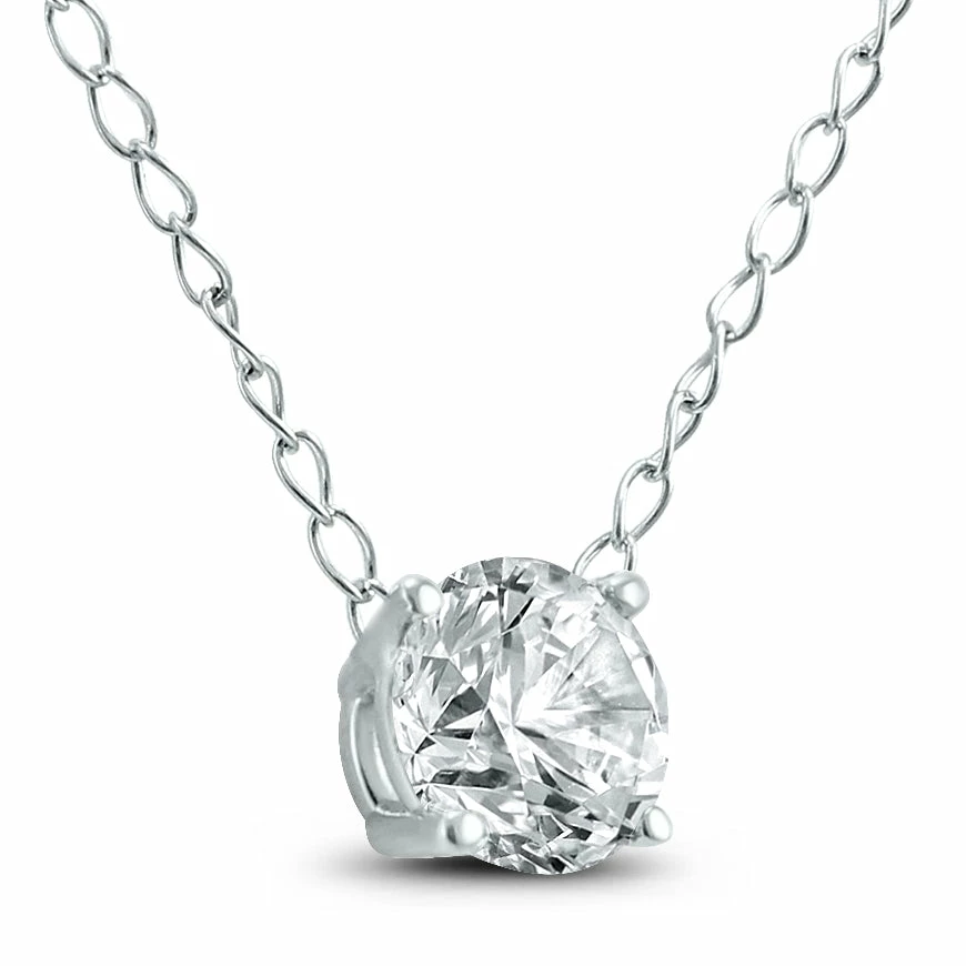 A carefully crafted diamond pendant featuring a sparkling 1/4 carat round brilliant diamond. Unlike traditional bulkier solitaire pendants with rabbit bails and separate chains, this diamond is set on a custom made 14K white gold all diamond setting for a pure floating look when worn. The chain measures 18 inches in length. The pendant is great for today’s layered jewelry fashions. This piece can be worn alone or with other pendants and necklaces. A great value for a simple, clean diamond solitaire necklace perfect for everyday wear.