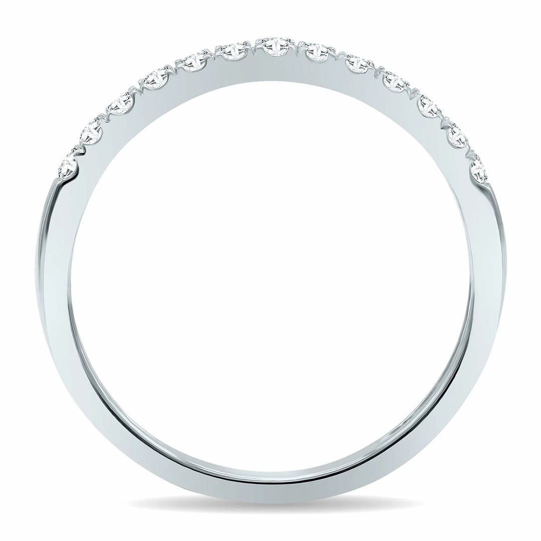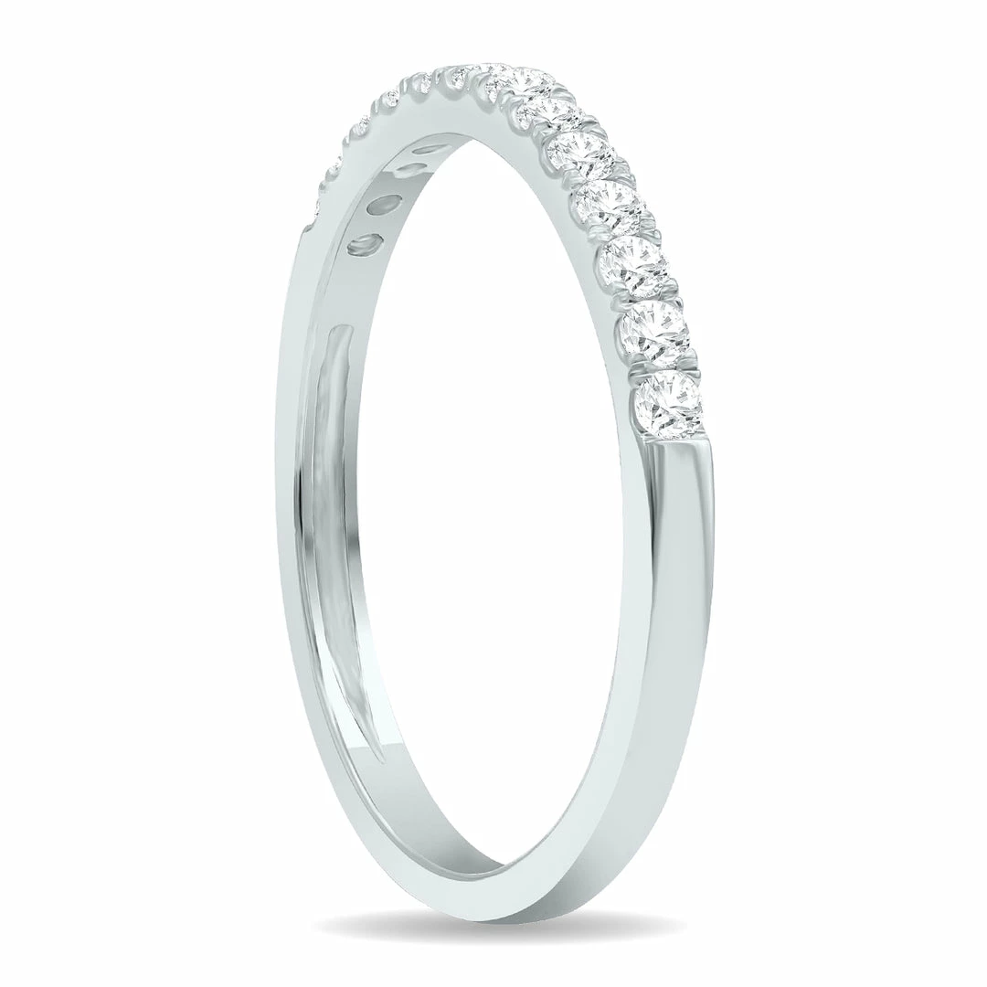 A classic 2mm diamond band crafted in 10K white gold. The diamond band features 13 round prong set white diamonds weighing 1/4 carat total weight. A beautiful band that can be worn as wedding band, anniversary band or as an everyday wear fashion diamond band. The diamonds are hand selected, matched and set by experienced jewelers with the highest attention to quality and finishing details. A perfect diamond band sure to be treasured forever. The band measures approximately 2mm in width and narrows to the bottom. Each stone weighs approximately .02 carats.