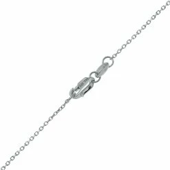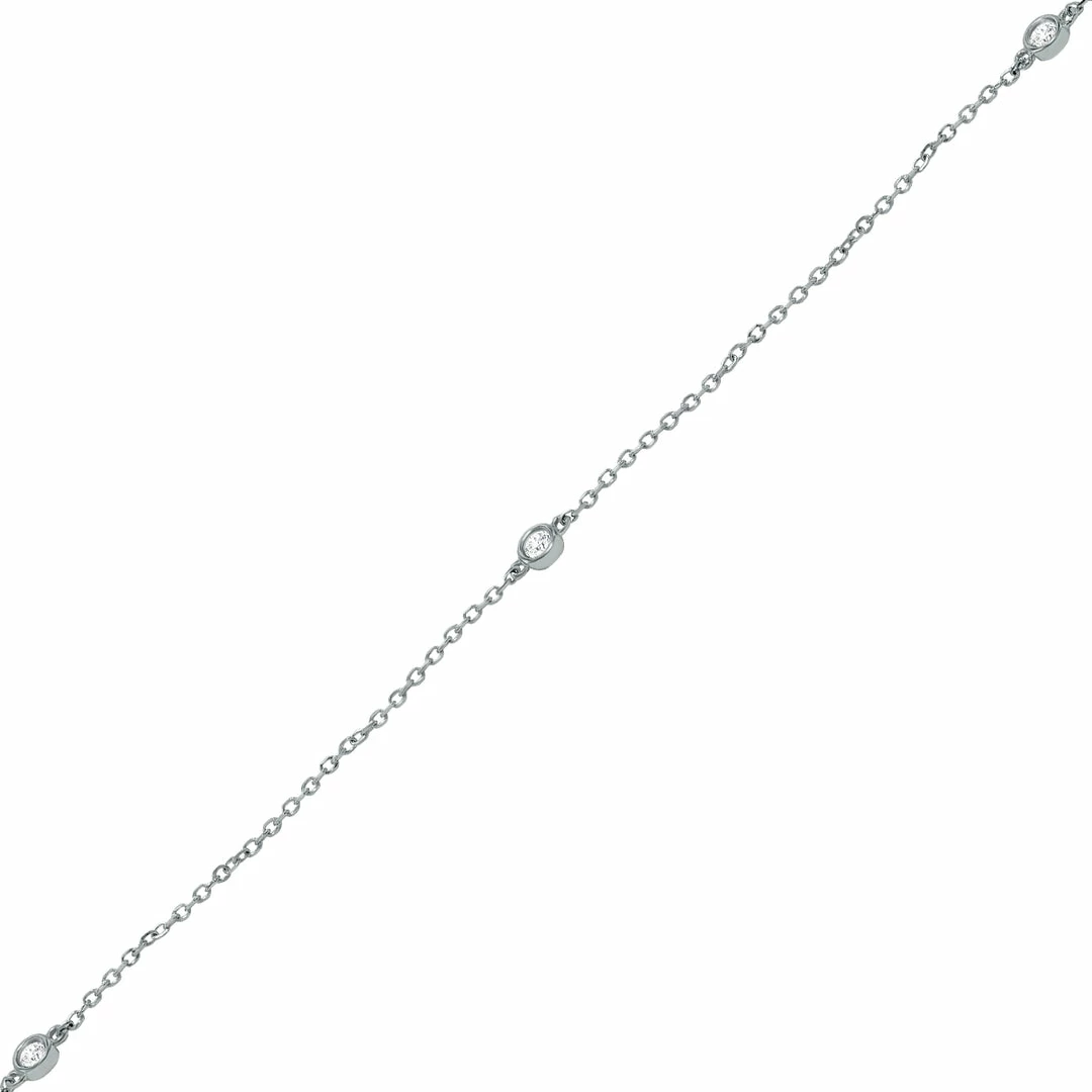A very stylish and popular diamond station necklace featuring 10 genuine bezel set diamonds weighing 1/4 carat total weight on a 14K white gold chain. The 0.80mm gage cable chain creates a cool, easy wear look perfect for today’s dainty fast fashion styles. The necklace secures with a durable lobster claw clasp. The necklace measuring 18 inches in length.