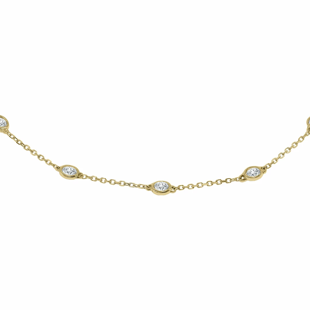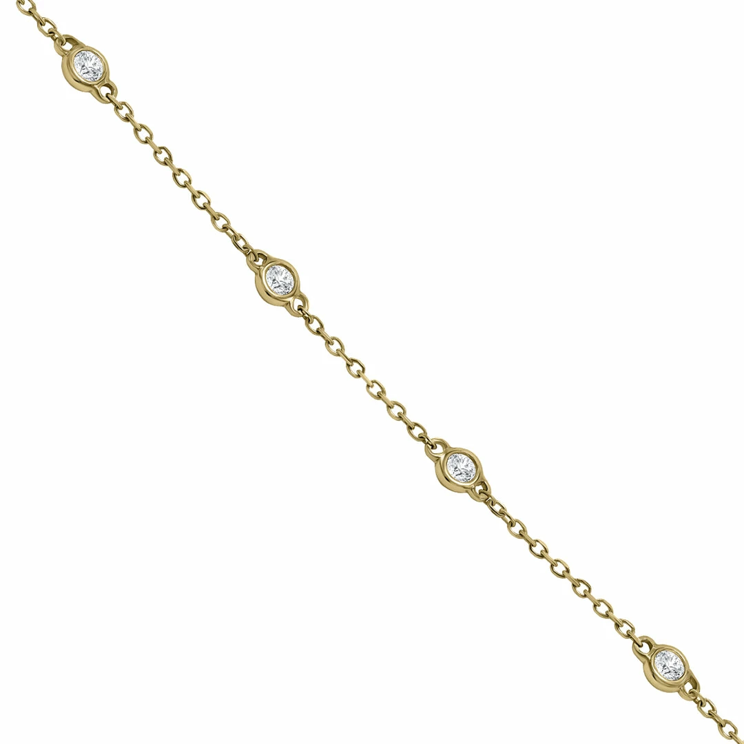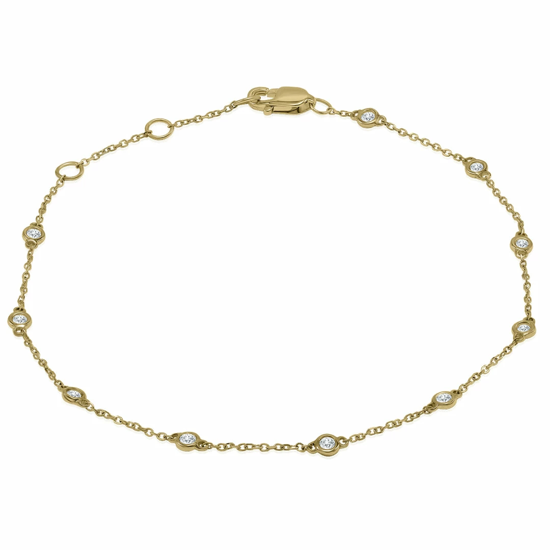 A very stylish and popular diamond station bracelet featuring 10 genuine bezel set diamonds weighing 1/4 carat total weight on a 14K yellow gold chain. The 0.80mm gage cable chain creates a cool, easy wear look perfect for todays dainty fast fashion styles. The bracelet secures with a durable lobster claw clasp. The bracelet measuring 7 inches in length.