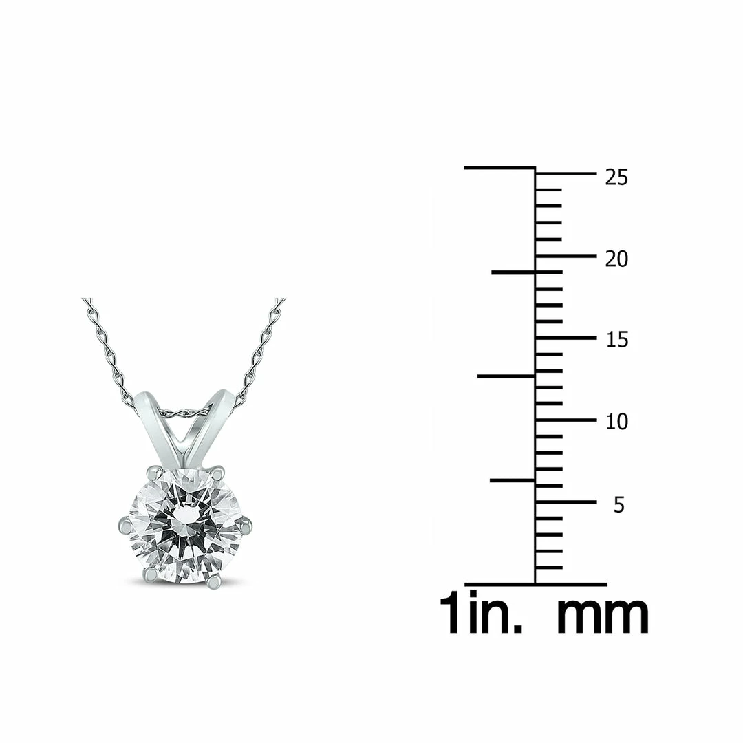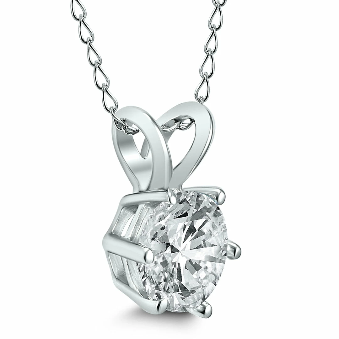 A stunning 6 prong diamond solitaire pendant set in 14K white gold. The round diamond weighs 1 carat. The pendant hangs from a 14K white gold chain that secures with a spring ring clasp.