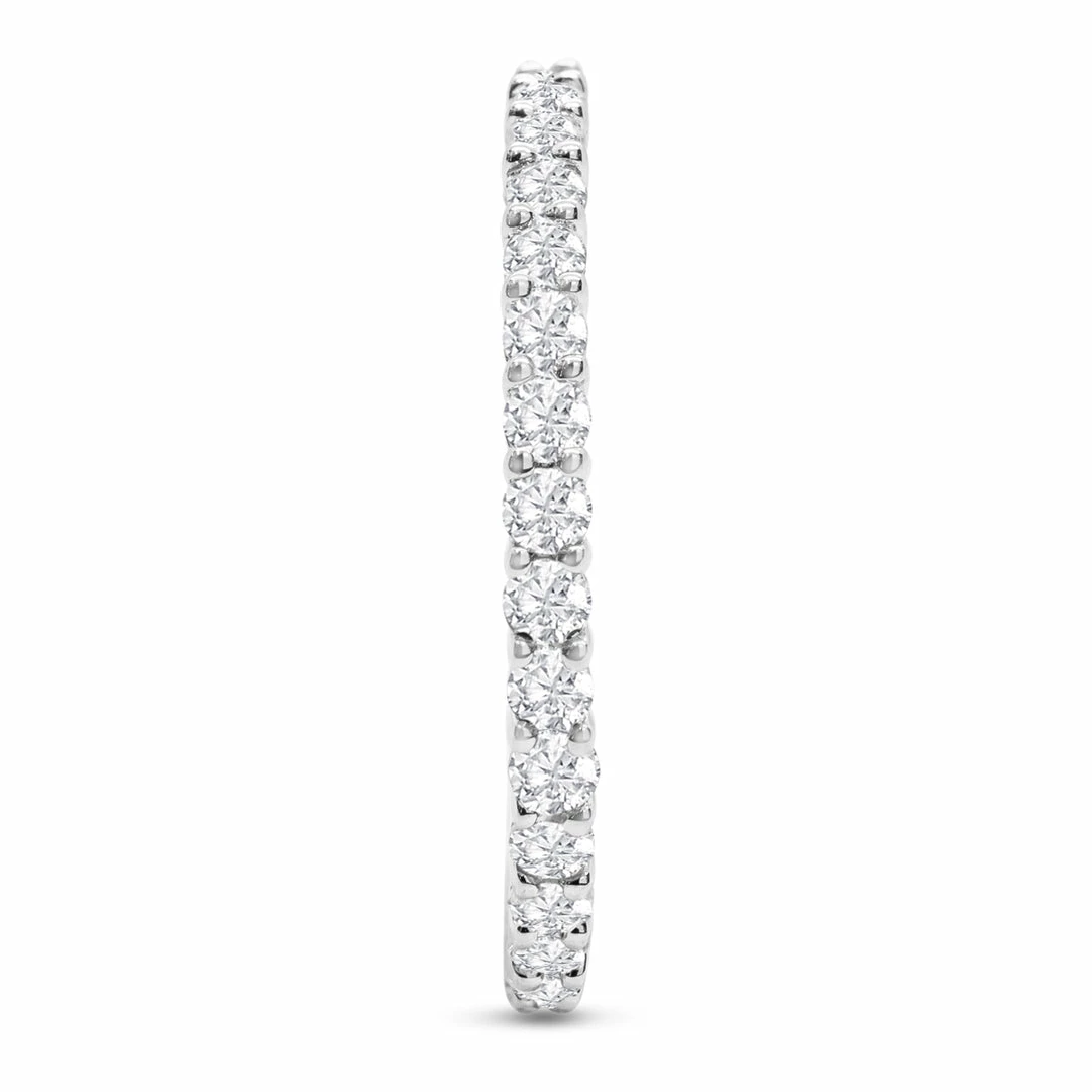 This classic eternity band features 26-32 round shape diamonds at approximately 1 carat total weight. Diamond color is H color, SI2 clarity. Ring is 2.1mm wide and is in 14 karat white gold.