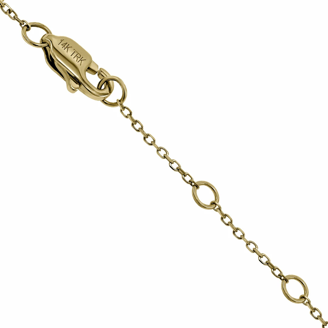 A very stylish and popular diamond station bracelet featuring 10 genuine bezel set diamonds weighing 1 carat total weight on a 14K yellow gold chain. The 0.80mm gage cable chain creates a cool, easy wear look perfect for todays dainty fast fashion styles. The bracelet secures with a durable lobster claw clasp. The bracelet measuring 7 inches in length.