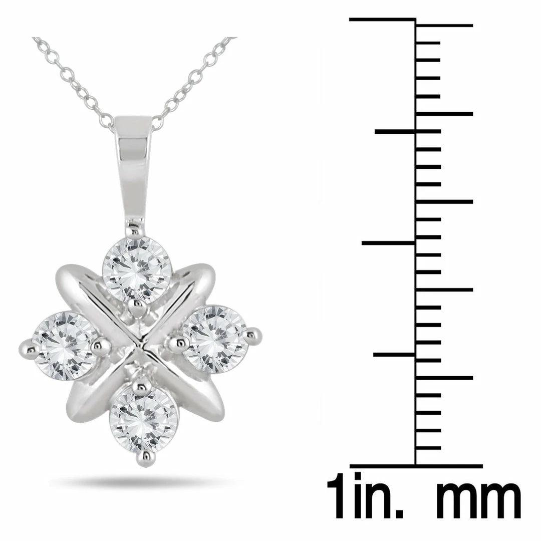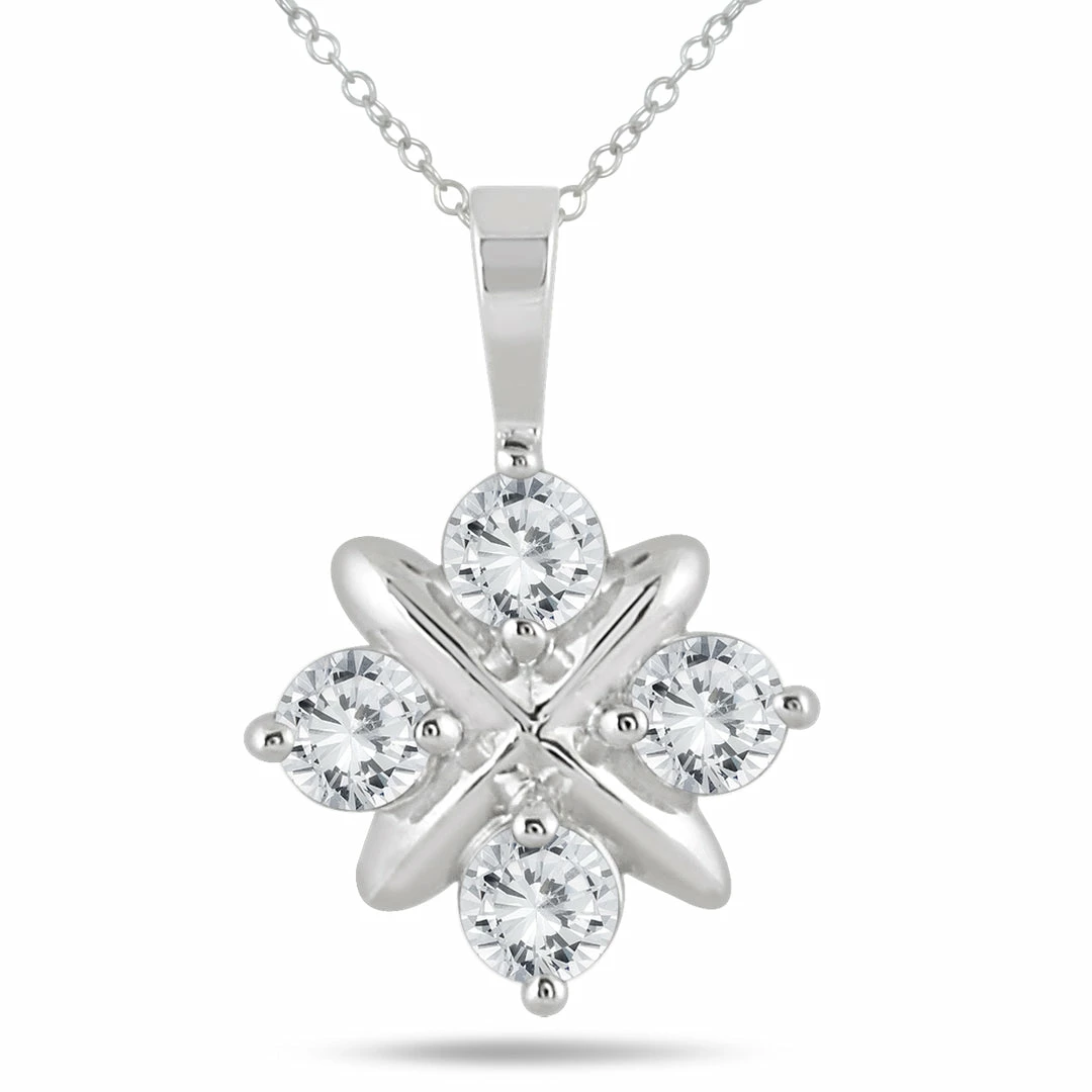 A beautifully crafted genuine diamond snowflake pendant set in 10K white gold. 4 all genuine, fiery round diamonds weigh 1 carat in total. The pendant measures 20mm x 13mm and hangs from an 18 inch chain also crafted in white gold. The diamonds are hand matched and have a white color and no major inclusions. An exceptional value on a 1 carat total weight diamond pendant in white gold!