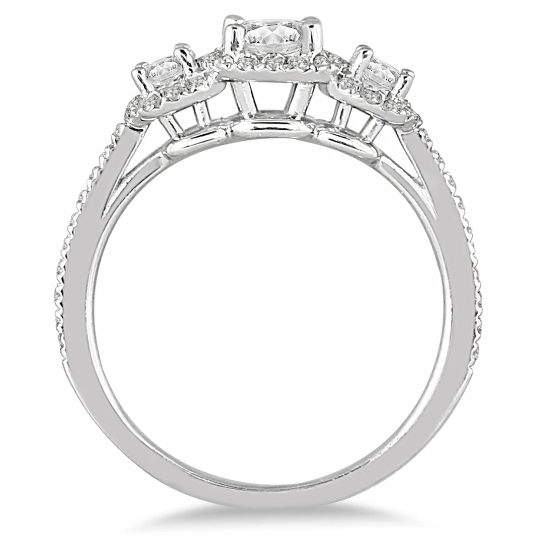 3 all natural white diamonds weigh 0.75 carat in total and are set in this beautiful three stone halo setting crafted in 14K white gold. 54 white diamonds weigh 0.27 carats in total. A very unique ring set in 14K white gold. A stunning ring with top of the line, all natural stones and excellent workmanship.
