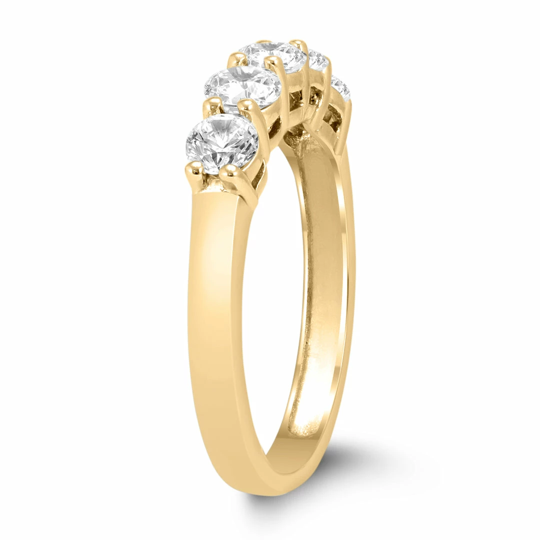 A beautiful five stone diamond band prong set in 14K yellow gold featuring 1 carat total diamond weight. The ring features hand selected and matched stones with precision setting by experienced jewelers. A beautiful 5 stone diamond band in 14K yellow gold.