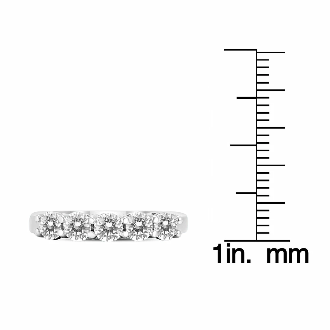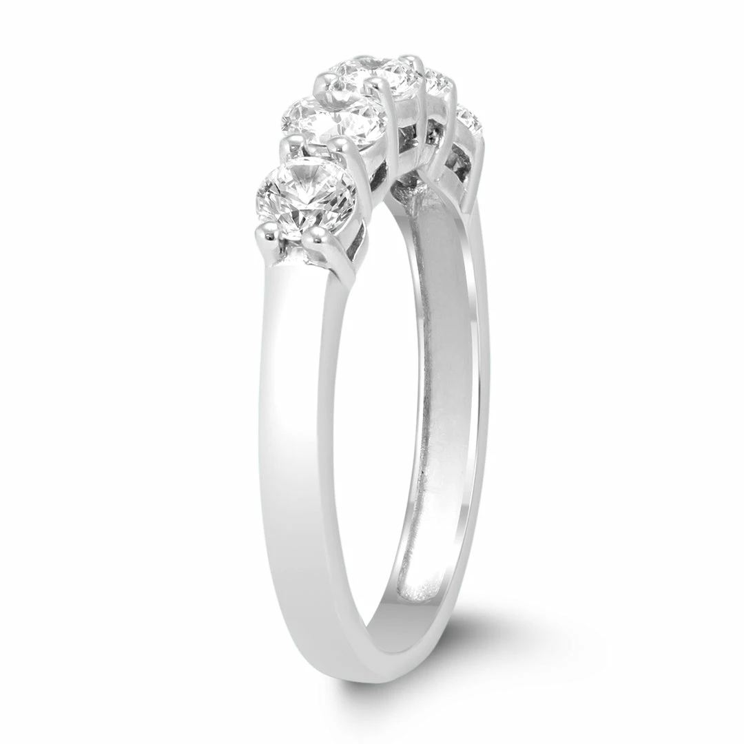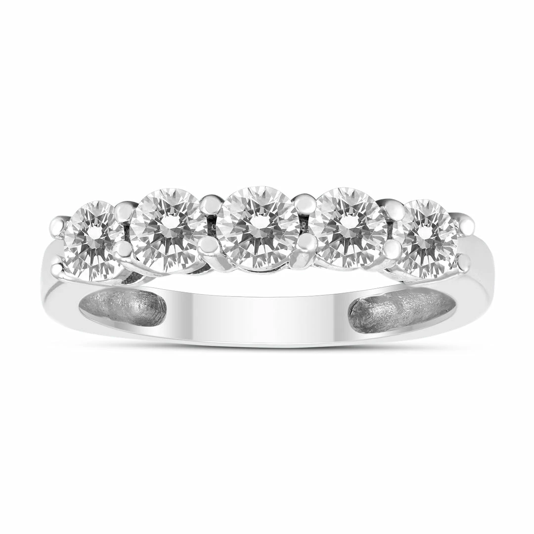 A beautiful five stone diamond band crafted in 14K white gold. 5 sparkling white diamonds weigh 1 carat in total. A versatile look that can be worn as a matching wedding band, an anniversary band or alone as a diamond fashion ring. Diamonds are hand selected, matched and set by experienced jewelers. Detailed workmanship and attention to setting detail make this a 5 stone diamond band that is sure to be treasured.
