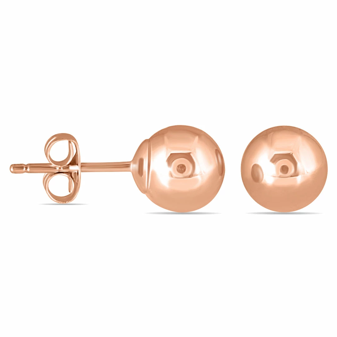 A pair of 10K rose gold ball earring studs perfect for everyday wear. The earrings measure 6mm in diameter and feature top of the line polish and finishing. The earrings secure on durable push back posts with butterfly locks. A great pair of quality 10K rose gold ball stud earrings.