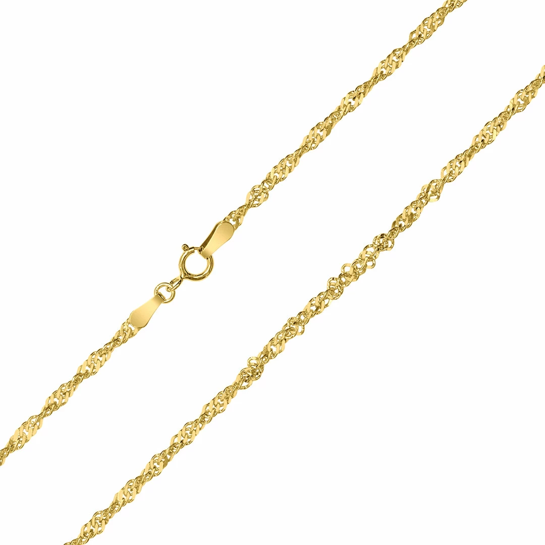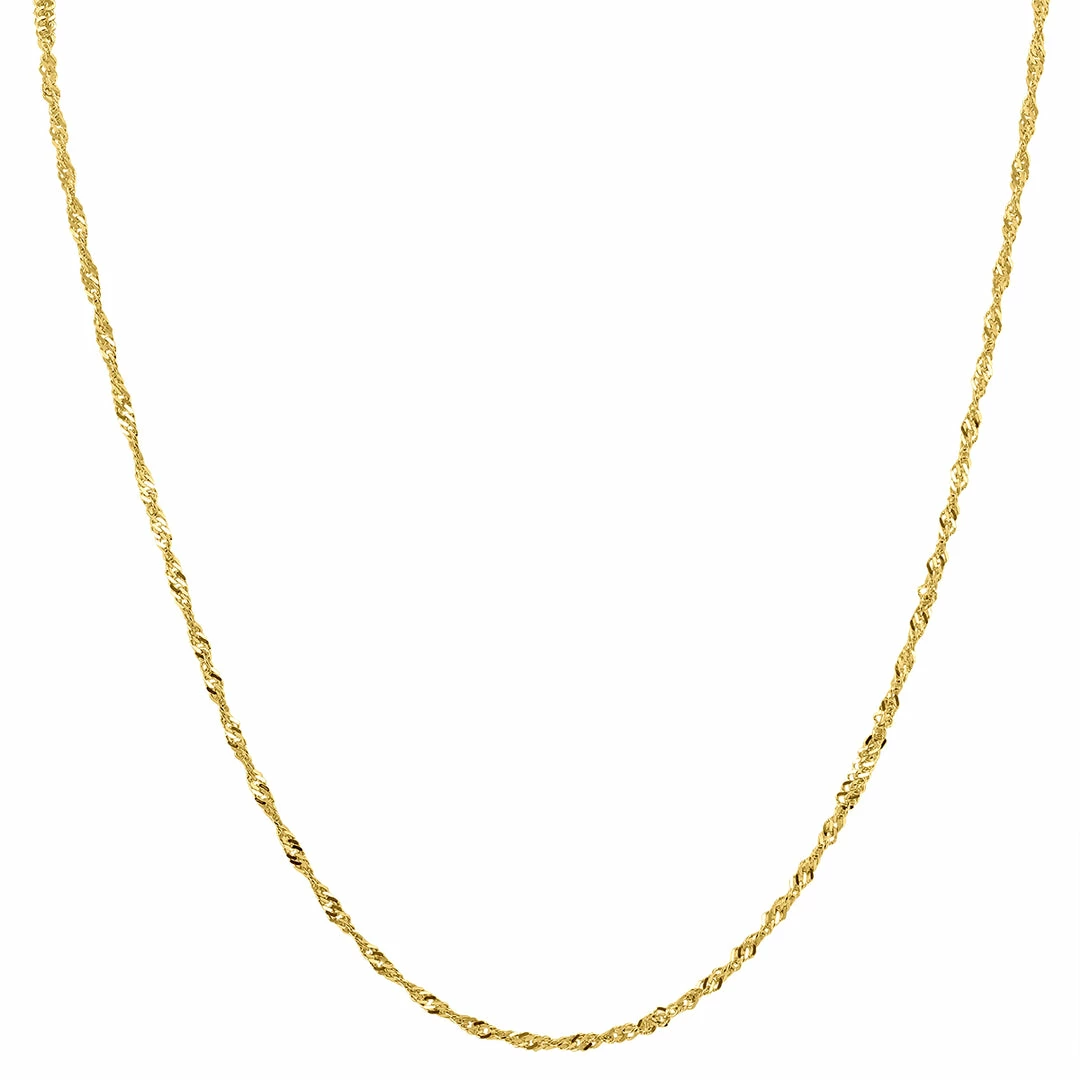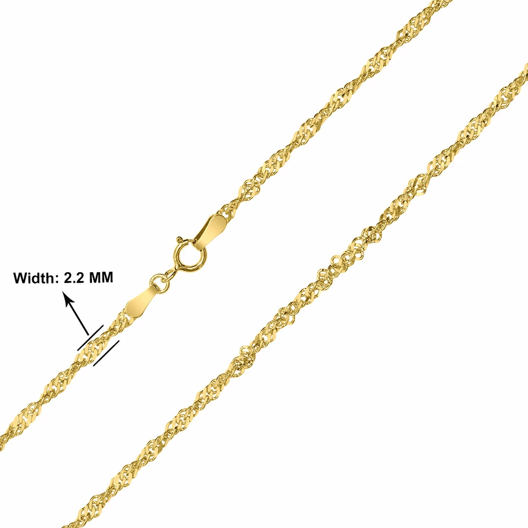 A beautifully constructed 2.2mm Singapore chain in 10K yellow gold. The chain secures with a durable spring ring clasp. An excellent quality 10K yellow gold chain perfect if worn alone or with a pendant. The chain measures 18 inches.