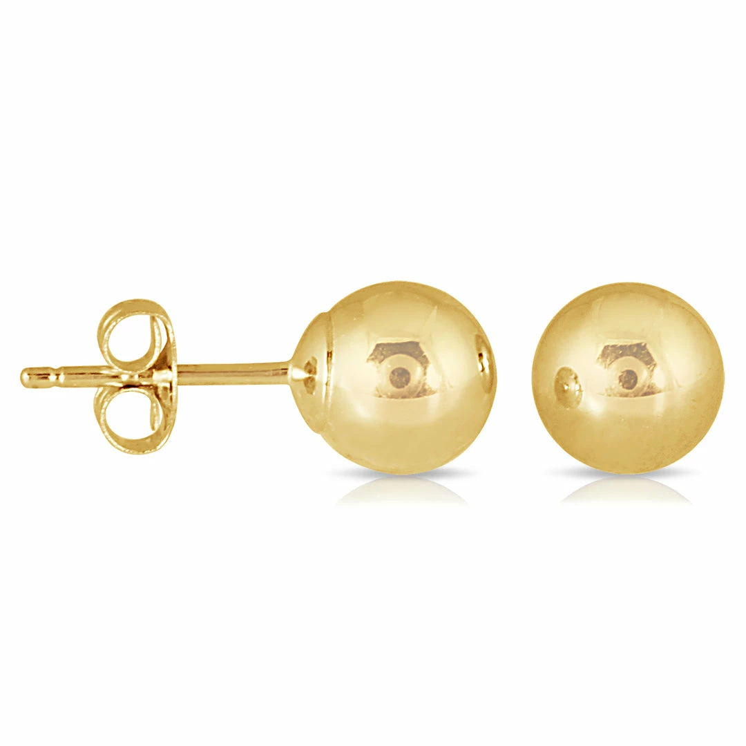 A pair of 10K yellow gold ball earring studs perfect for everyday wear. The earrings measure 6mm in diameter and feature top of the line polish and finishing. The earrings secure on durable push back posts with butterfly locks. A great pair of quality 10K yellow gold stud ball earrings.
