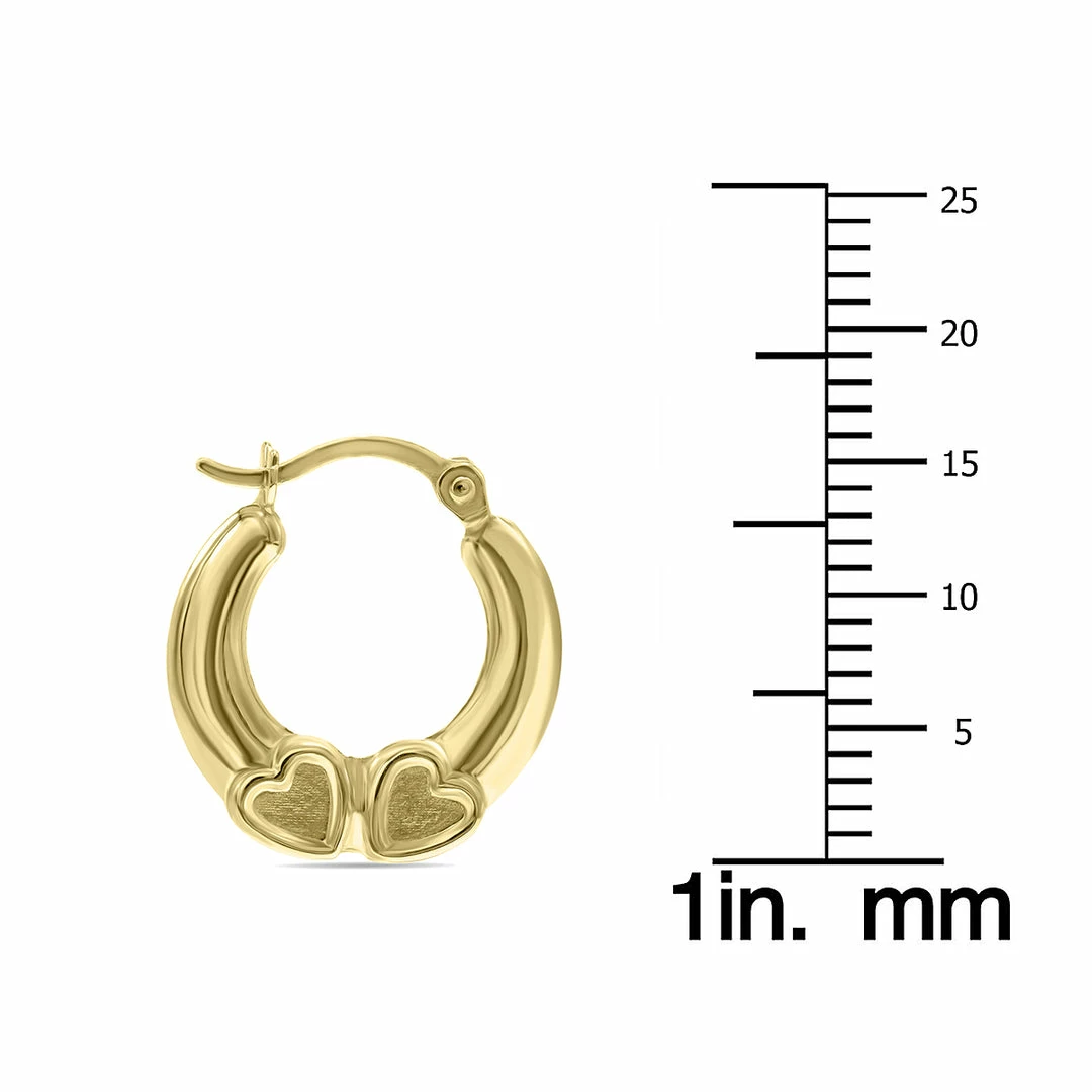 A stylish pair of double heart-shaped huggie hoop earrings crafted in 10K yellow gold. The earrings secure with durable snap-down latch clasps and measure just over half an inch in length. This dainty pair of shiny hoop earrings are great for day and evening wear. Crafted with the utmost perfection by experienced jewelers, these earrings are sure to elevate your jewelry collection.