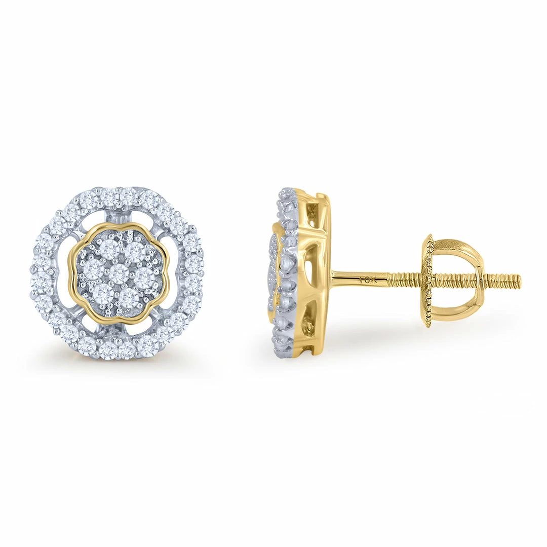 This beautiful pair of diamond earrings features a total of 0.35 carats of GH-SI diamonds. The diamonds are prong-set in 10K two-tone yellow white gold. The earrings are completed with a screw on the backends for added protection.