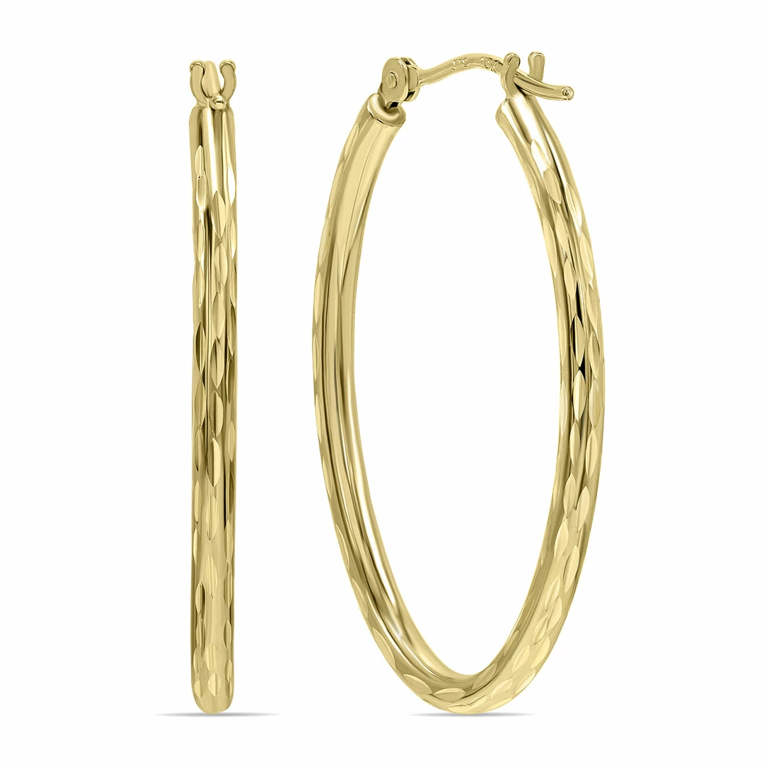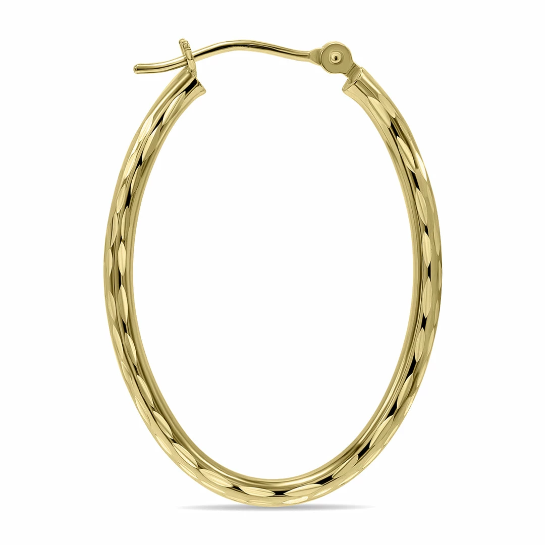 A stylish pair of U-shaped 10K yellow gold hoop earrings with a unique twist. This magnificent set of earrings differentiates from your classic gold hoop by featuring a subtle yet bold pattern. At just over an inch in length, this earring will add a distinct flair to any look and stay secure all day because of its snap-down clasp. This earring is sure to enhance your natural beauty and elevate your jewelry collection.