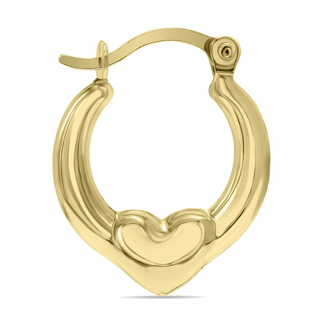 These dainty 10K huggie gold hoop earrings with a heart are a fashionable and fun take on the classic hoop earring. At just a little over an inch in width and length, these earrings would pair with any outfit or at any event by adding a touch of sophistication. They are perfect for anyone on the go who prioritizes comfortability and functionality while still looking their best.