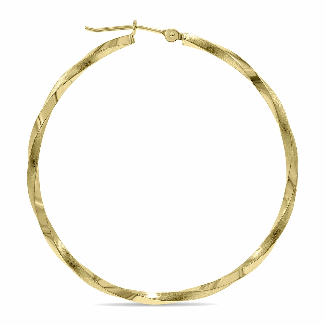 A stylish and innovational take on the conventional gold hoop, these beautifully crafted 10K twisted yellow gold hoops are perfect for anyone. At just over 1.50 inches in length and width, these earrings are a shop-stopping piece for a standalone moment. Also featuring a snap-down clasp, you can ensure that these earrings will be secure all day. If you want to elevate your office attire or add a bold flair to your evening look, these earrings are perfect for you!