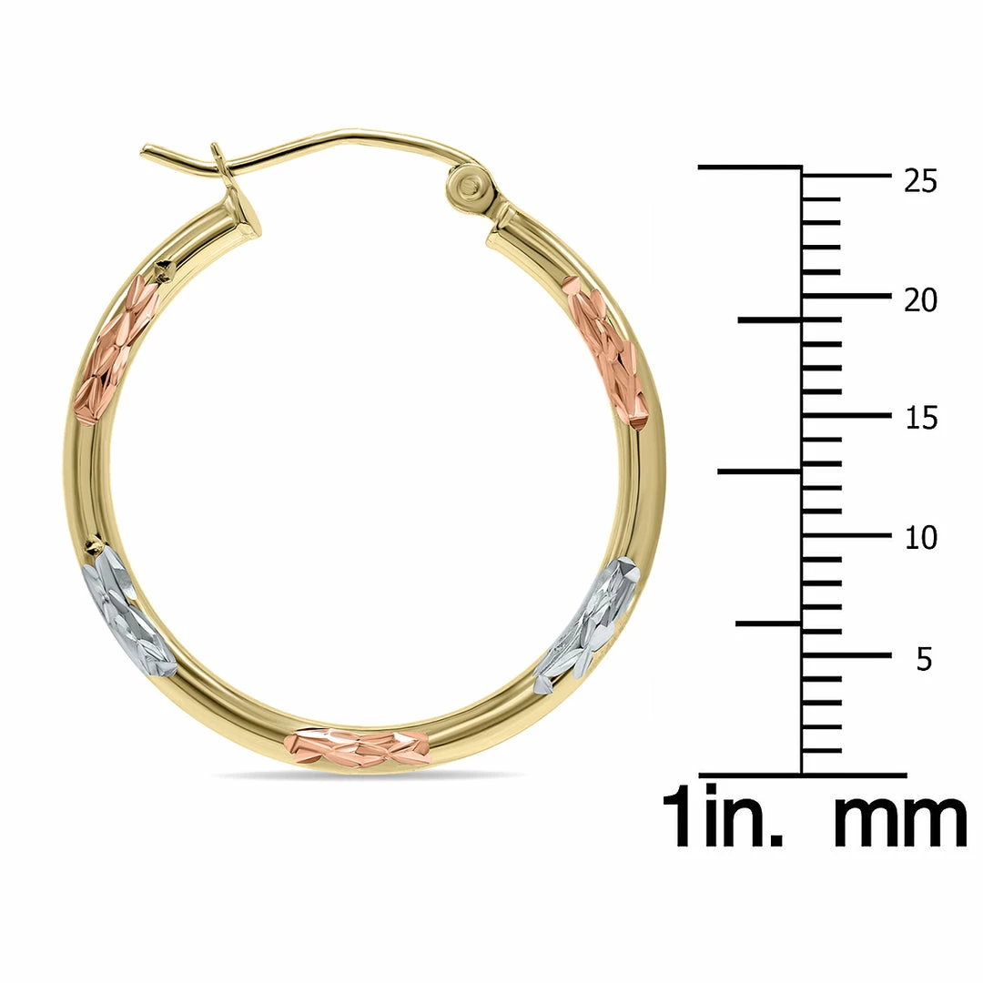 A fashion-forward addition to the conventional gold hoop earring, these masterfully crafted 10K yellow gold hoops with two-toned embedded detailing are one of a kind. These earrings are perfectly sized for anyone at just over an inch in length and width. They also feature a snap-down clasp which ensures durability and security for anyone on the go.