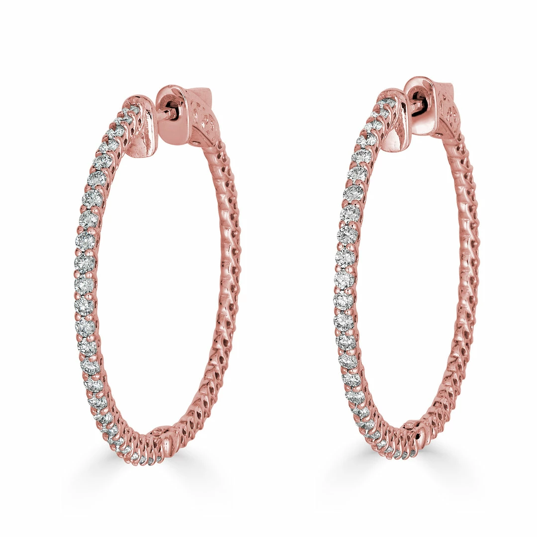 This pair of 14K white gold hoop earrings is a classy way to showcase your daily style. It features a total of 1.12 carats of GH-SI diamonds that is prong-set in each earring. The diamonds are evenly spaced, allowing the pair to be worn in a variety of ways. It is designed to sit flush on the ear, making it the perfect set to complete any outfit, any season, and any occasion.