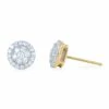 This pair of 14K yellow gold earrings features 0.34 total carat weight of GH-SI diamonds. The front is white gold and the frame and back is yellow gold with 14K stamp. The diamonds are set in a four-prong setting. The earring has a push back which ensures a secure fit.