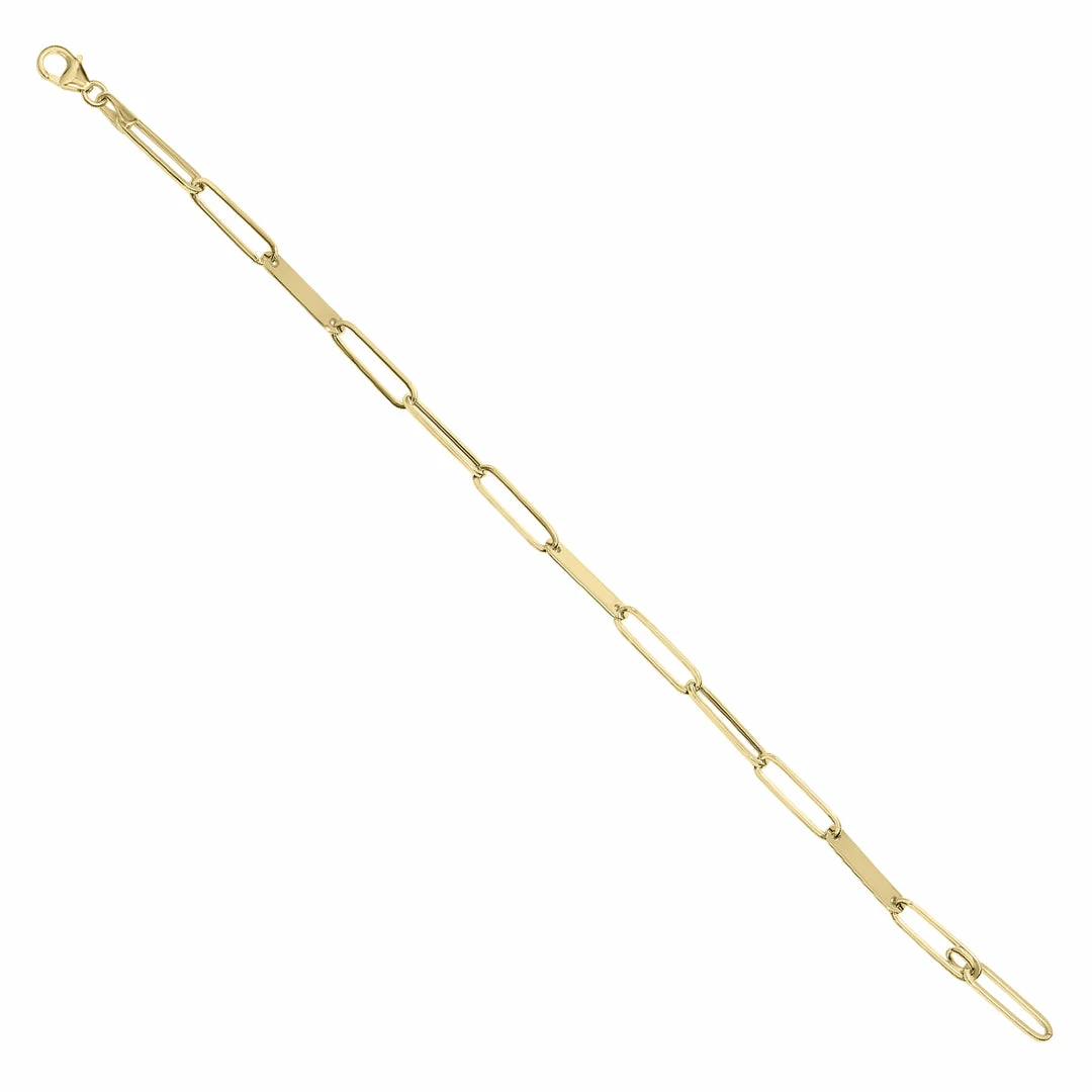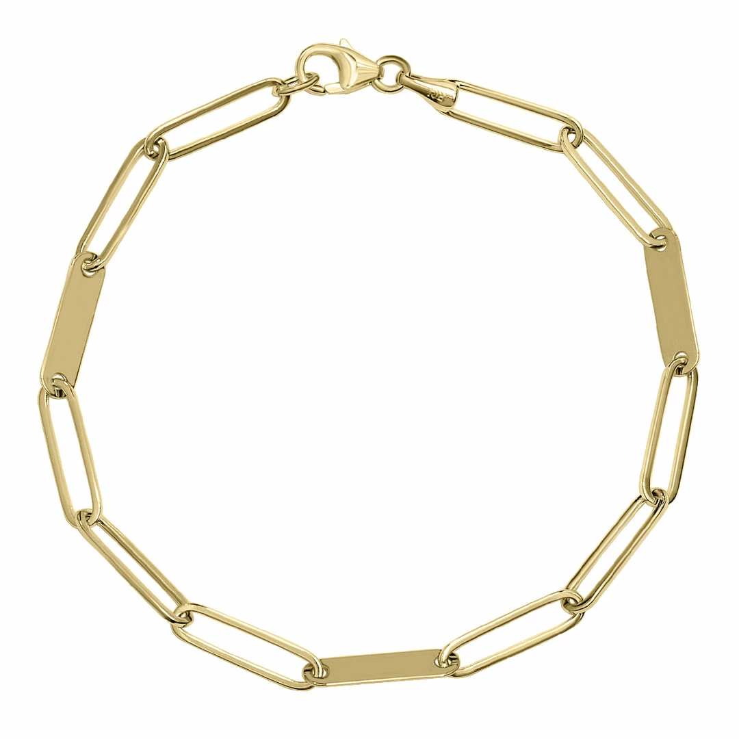 This bracelet takes a unique twist on the stylish paperclip design and is perfect for anyone who likes trendy pieces with flare. This stunning 14K yellow gold paperclip bracelet with a lobster clasp features three filled-in links that add the most special touch to this accessory. Whether you layer it with other bracelets for a bold look or alone for simple sophistication, it is sure to turn heads.