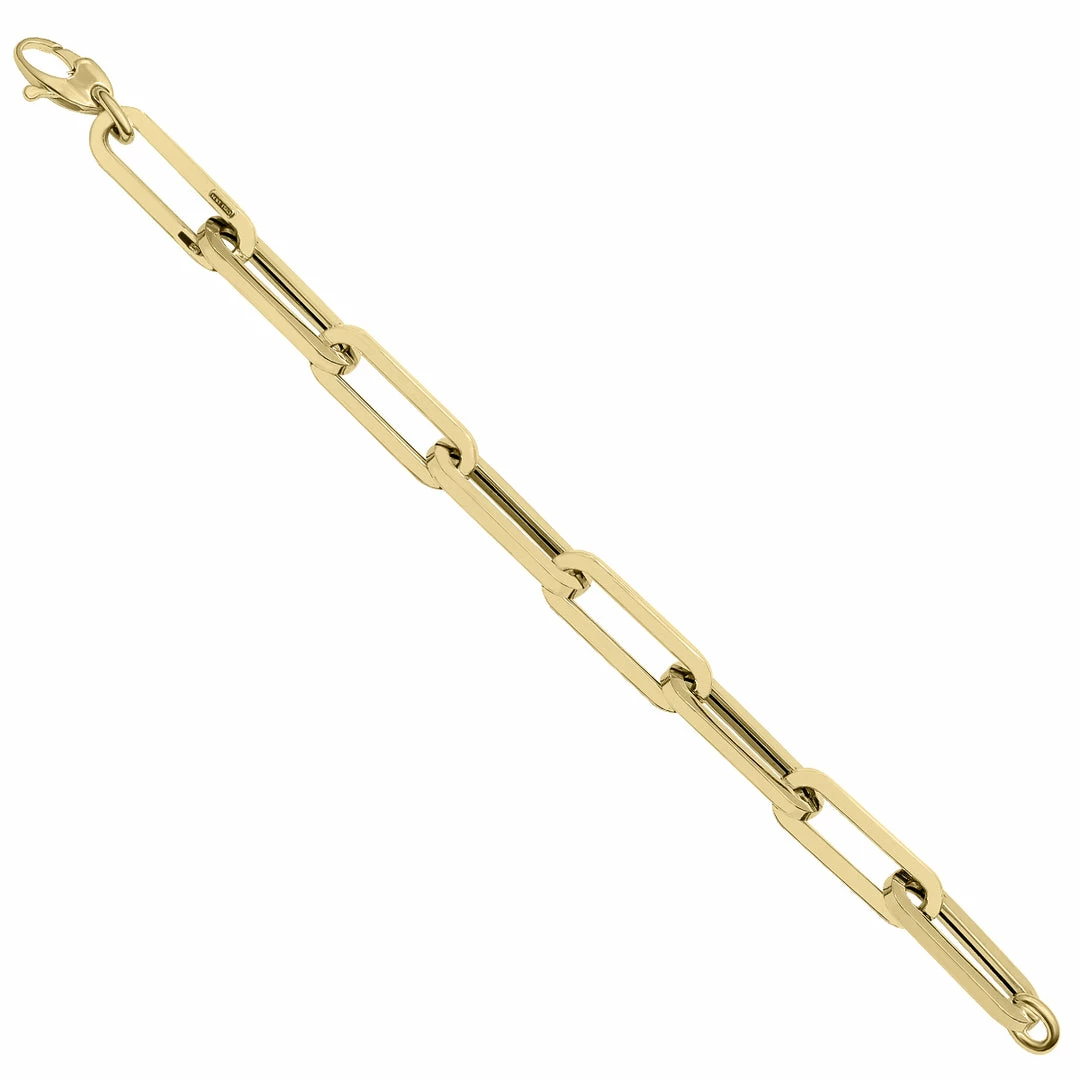 This stunning and chunky 14K yellow gold paperclip bracelet with a lobster clasp is perfect for anyone looking to make a bold and fashion-forward statement with their jewelry. The masterful craftsmanship of this piece makes it a wonderful stand-alone bracelet that is sure to turn heads. This bracelet is the perfect accessory for any occasion whether you are running to the office or to a black-tie event.