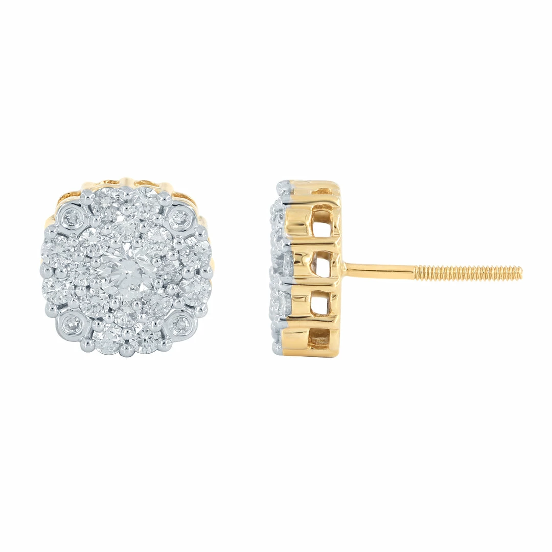 This beautiful pair of diamond cluster earrings features a total of 0.98 carats of GH-SI diamonds. The diamonds are prong-set in 14K yellow gold. The earrings are completed with a screw on the backends for added protection.