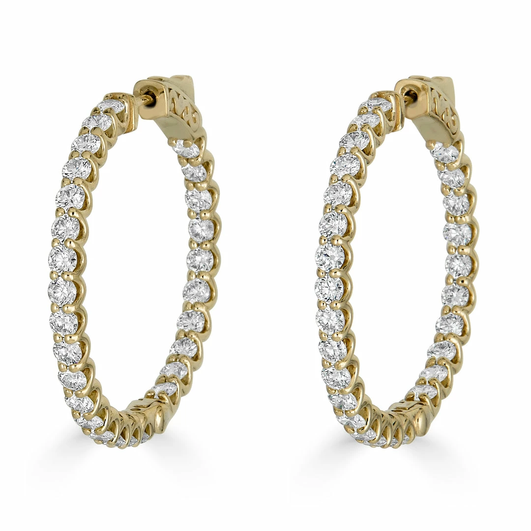 This pair of 14K white gold hoop earrings is a classic style with a modern twist. The earrings feature a total of 3.36 carats of GH-SI diamonds that are set facing towards the front. It’s perfect for a modern day woman who wants to look classic and elegant.
