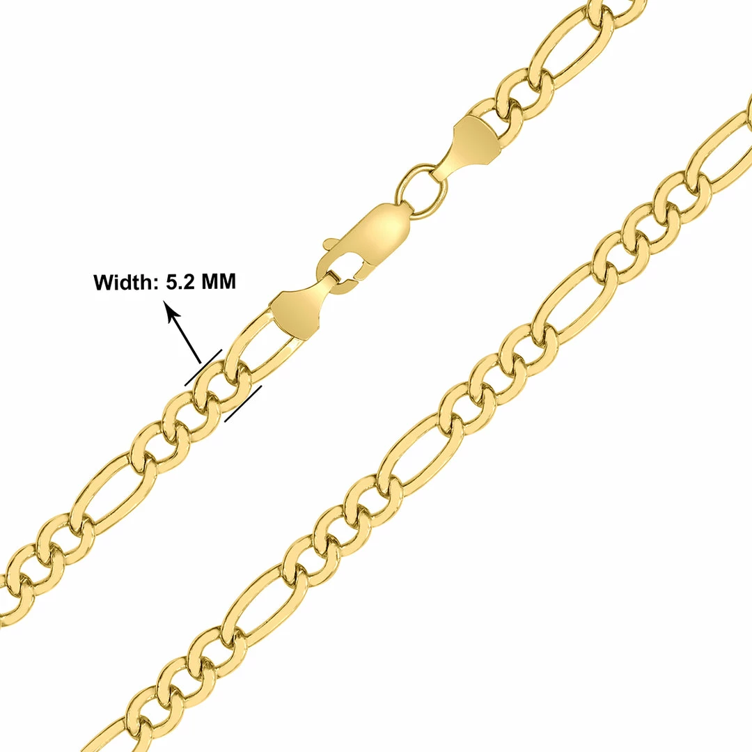 A beautifully crafted 14K yellow gold filled 5.2mm Figaro chain. The chain secures with a durable lobster clasp. The chain measures 18 inches in length. Gold filled jewelry consists of a layer of gold bonded to the underlying base metal. Unlike gold plating, gold filled jewelry is crafted with gold that constitutes at least 5% of the total item weight and will not fade or tarnish like plated jewelry often can. It can withstand heat and water over time.