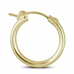 A pair of 14K yellow gold filled hoop earrings with snap down clasps. These durable hoop earrings measure 19mm in diameter. Gold filled jewelry consists of a layer of gold bonded to the underlying base metal. Unlike gold plating, gold filled jewelry is crafted with gold that constitutes at least 5% of the total item weight and will not fade or tarnish like plated jewelry often can. It can withstand heat and water over time. These gold filled hoop earrings are great quality and perfect for everyday wear.