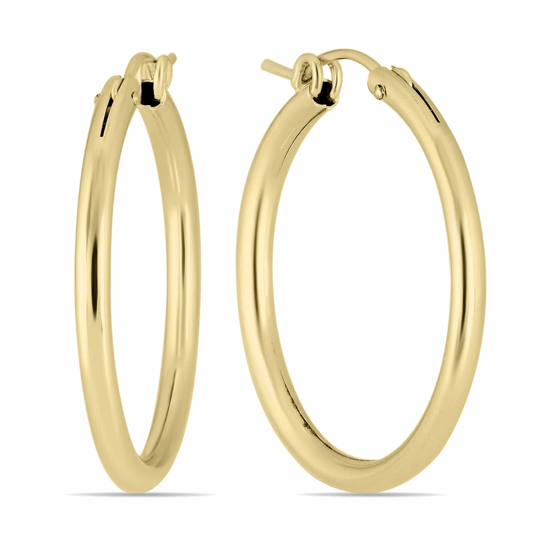 A pair of 14K yellow gold filled hoop earrings with snap down clasps. These durable hoop earrings measure 27mm in diameter. Gold filled jewelry consists of a layer of gold bonded to the underlying base metal. Unlike gold plating, gold filled jewelry is crafted with gold that constitutes at least 5% of the total item weight and will not fade or tarnish like plated jewelry often can. It can withstand heat and water over time. These gold filled hoop earrings are great quality and perfect for everyday wear.