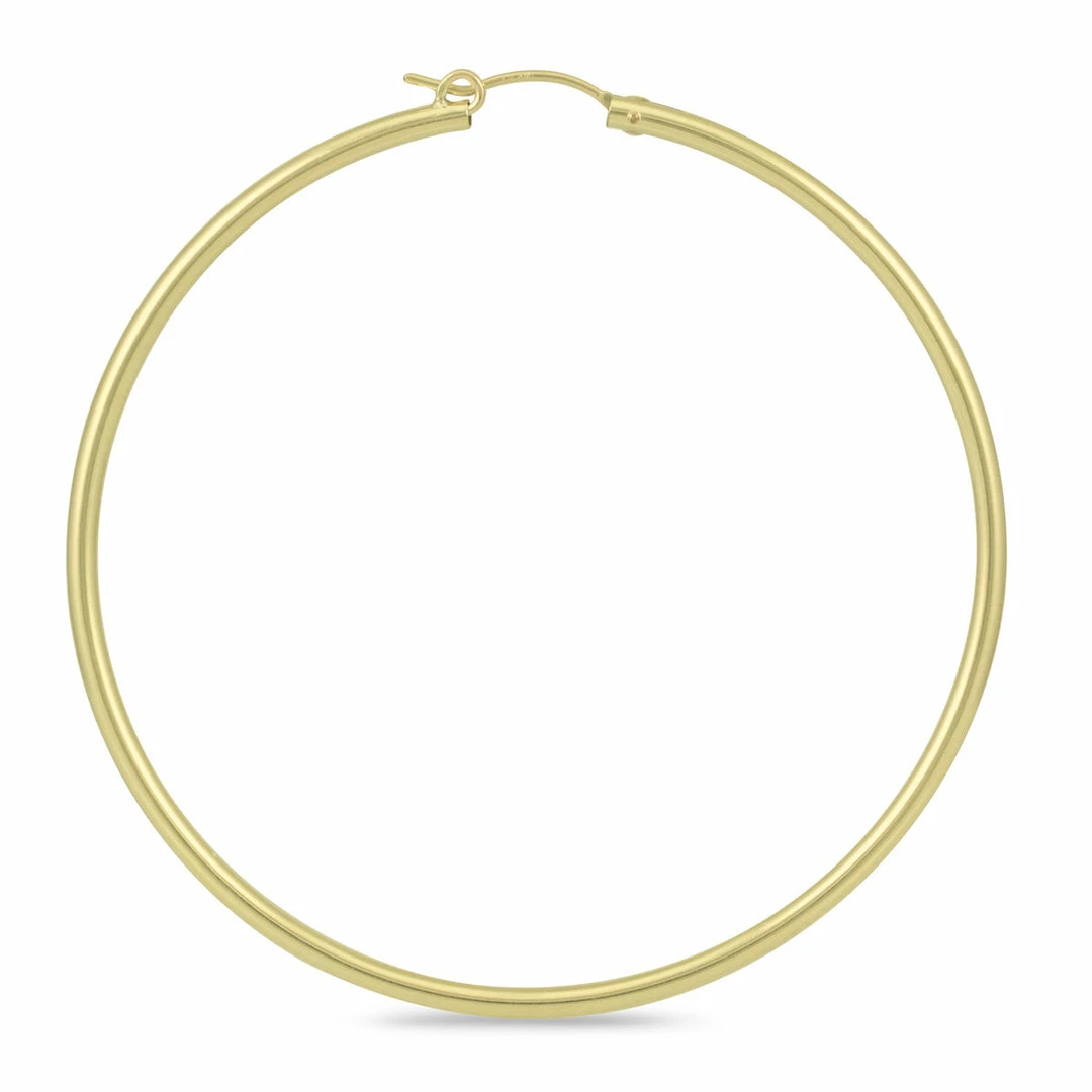 A pair of 14K yellow gold filled hoop earrings with snap down clasps. These durable hoop earrings measure 62mm in diameter. Gold filled jewelry consists of a layer of gold bonded to the underlying base metal. Unlike gold plating, gold filled jewelry is crafted with gold that constitutes at least 5% of the total item weight and will not fade or tarnish like plated jewelry often can. It can withstand heat and water over time. These gold filled hoop earrings are great quality and perfect for everyday wear.