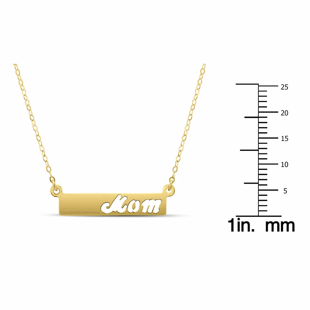 A simple, stylish cutout MOM bar necklace crafted in 14K yellow gold. The bar measures 20mm in length and 4mm in width. The plate has a 1.2mm gage thickness. The chain measures 17 inches in length.