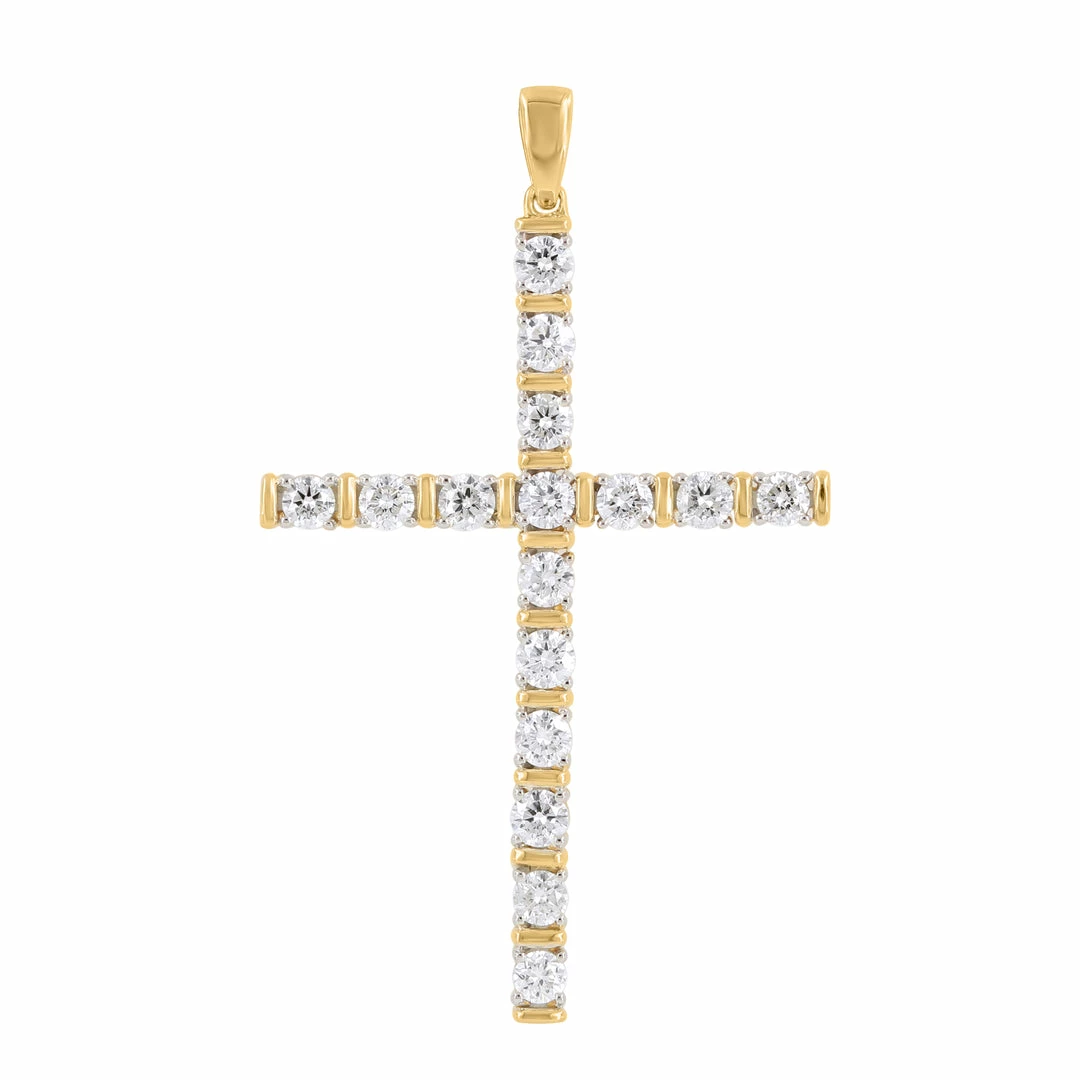 This 14K two-tone gold cross pendant is the perfect symbol of a religious lifestyle. The cross is designed to be a true piece of art that looks very elegant and will stand out from the rest. The cross is crafted from 14K yellow gold, and it is set with 1.01 carats of GH-SI diamonds. The prongs are made from white gold for a better shine, and the frame and back are also made from 14K yellow gold.