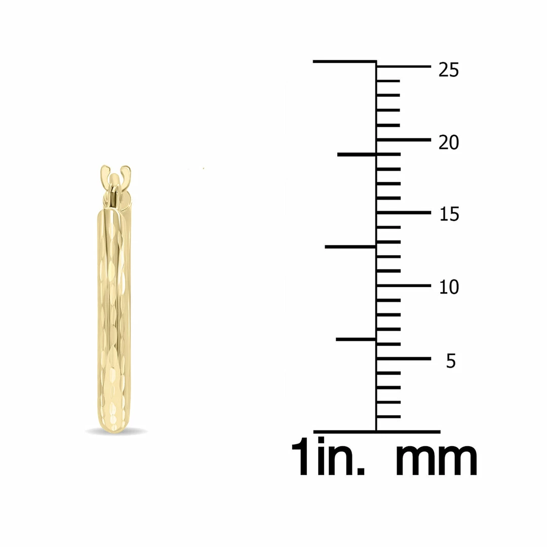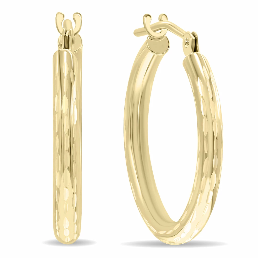 A stylish pair of round shaped hoop earrings crafted in 14K yellow gold. The hoops feature detailed diamond cut engraving. The earrings secure with durable snap down latch clasps. The earrings measure approximately 18mm in length. A stylish pair of shiny hoop earrings great for day and evening wear.