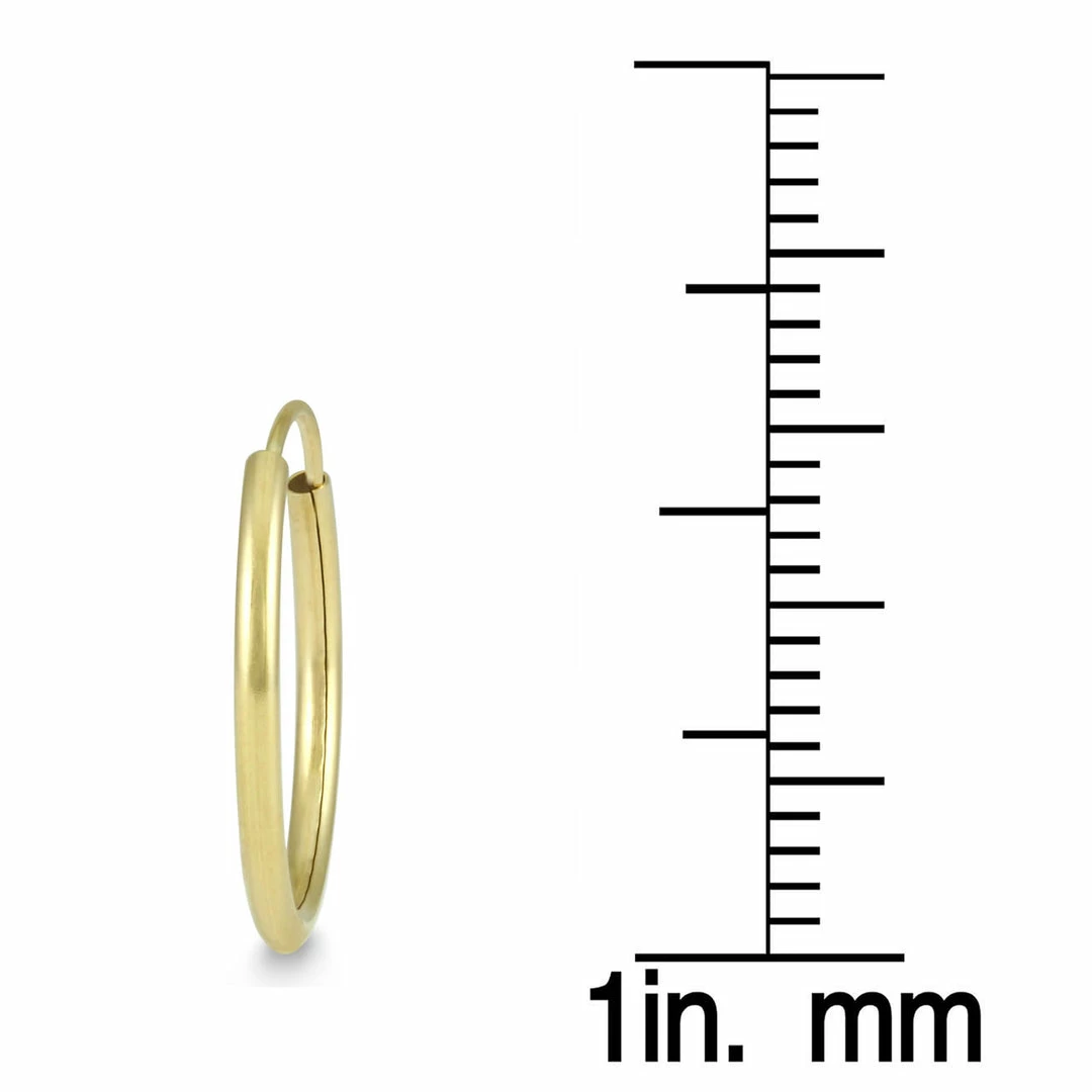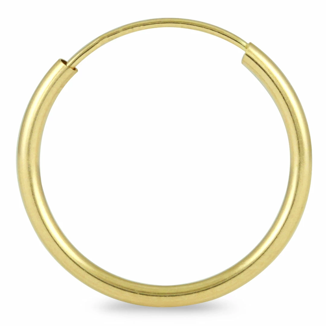 A pair of endless hoop earrings crafted in 14K yellow gold. The hoop earrings measure 16mm in diameter. A quality pair of hoop earrings with durable slide in clasp for an endless hoop effect. The earrings have a 2mm thickness gauge.
