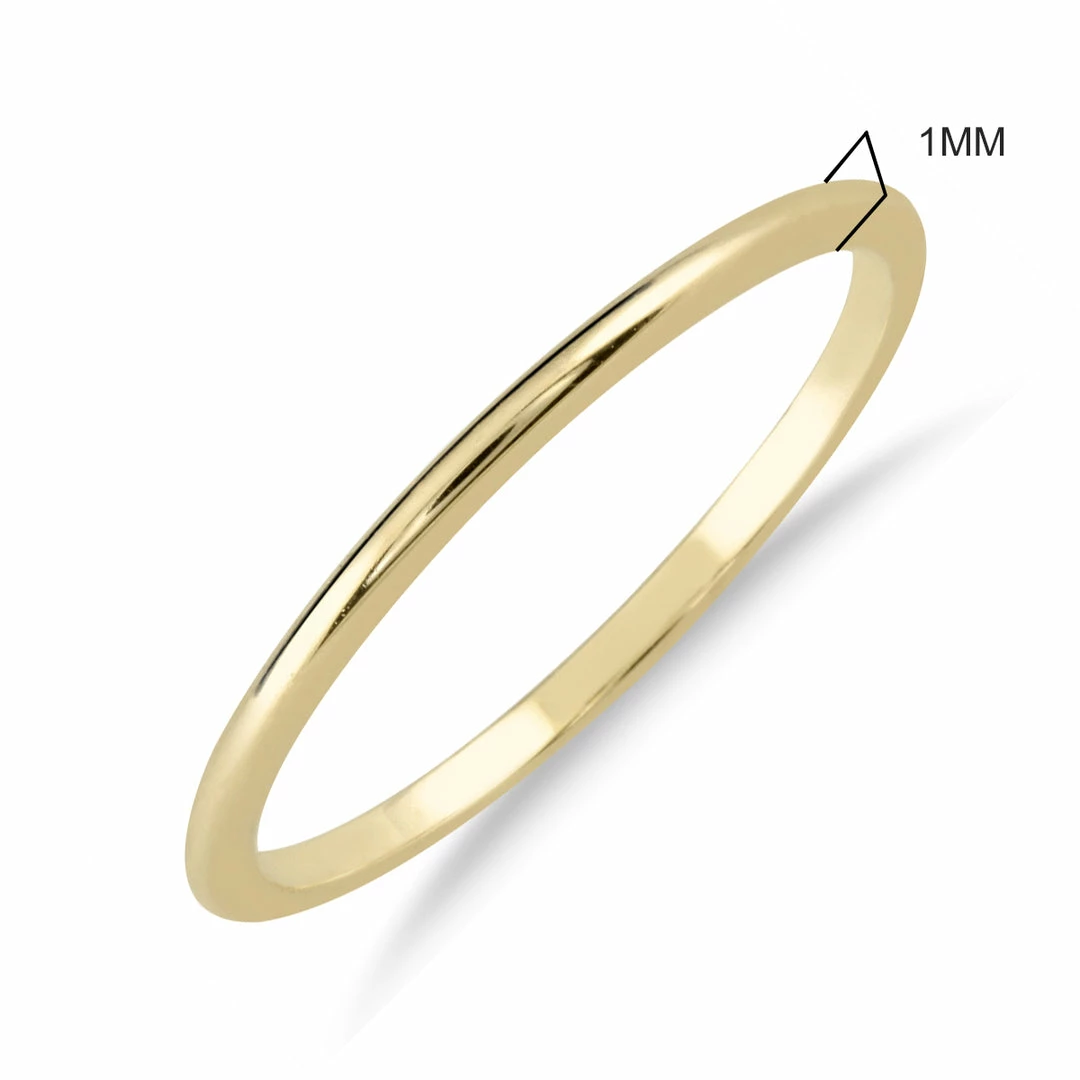 A beautifully crafted plain domed 1mm band crafted in 14K yellow gold. A simple band that can be worn alone, alongside an engagement ring, or stacked with other rings. A great ring crafted with the highest level of workmanship. These rings are built to last forever in 14K yellow gold. Please note that this band measures 1mm in width and is meant for a delicate and dainty look.