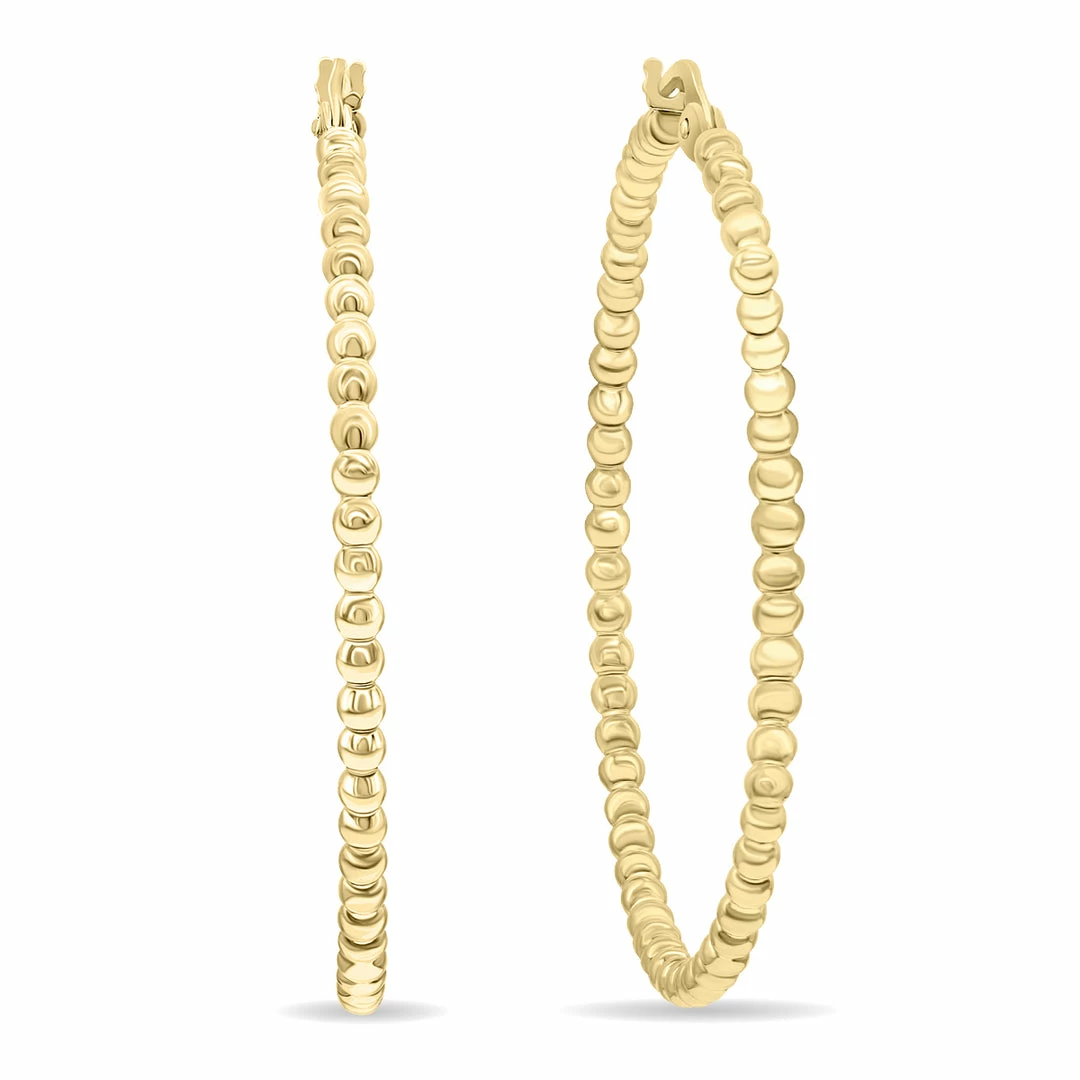 A beautiful pair of large 1.50 inch diameter beaded hoop earrings crafted in 14K yellow gold fill. A fun pair of gold filled hoop earrings great for casual and formal wear. The beaded finish give a fashionable twist to an otherwise traditional pair of large 1 1/2 inch diameter hoop earrings. The earrings secure with standard snap down posts. The earrings have an approximate gage or thickness of 1.5mm. Gold filled jewelry consists of a layer of gold bonded to the underlying base metal. Unlike gold plating, gold filled jewelry is crafted with gold that constitutes at least 5% of the total item weight and will not fade or tarnish like plated jewelry often can. It can withstand heat and water over time.