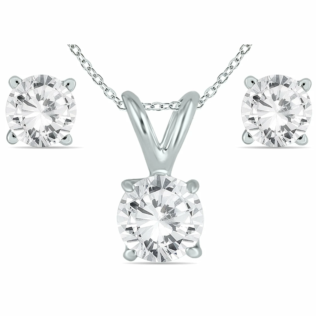 A 5/8 carat total weight solitaire ensemble. The earrings weigh .40 carat in total and are set on durable 14K white gold basket set earrings with push back posts and a .20 carat diamond is set on a 14K white gold pendant that hangs from an 18 inch chain also crafted in 14K white gold. . Excellent quality diamonds hand matched and set to perfection. a wonderful matching set sure to be treasured forever. Great for every day wear!