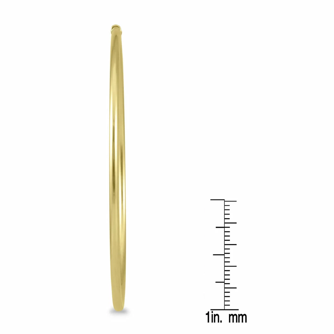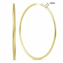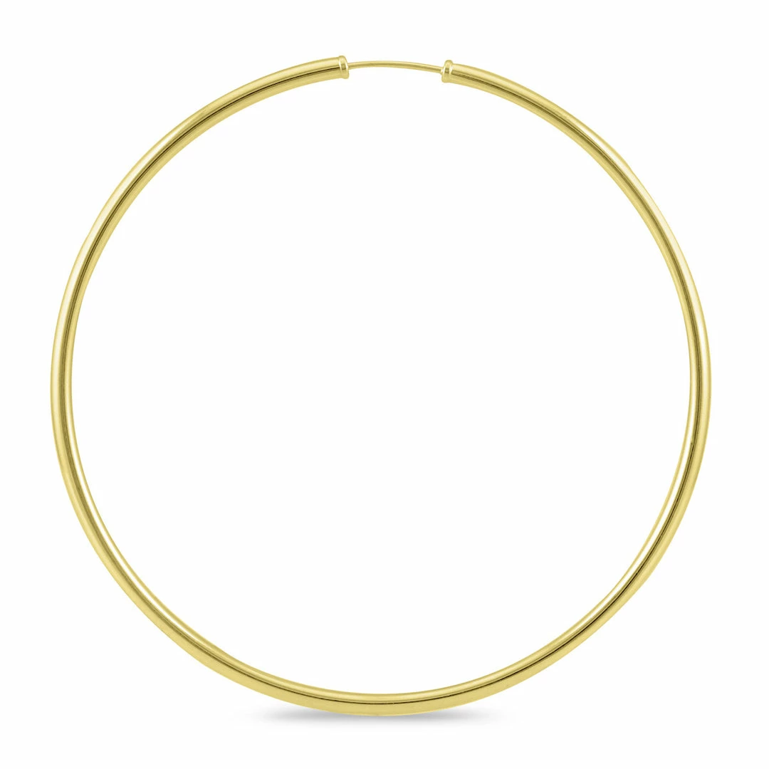 A pair of 14K yellow gold endless hoop earrings. The hoop earrings measure 60mm in diameter. A quality pair of 14K yellow gold hoop earrings with a durable slide in the clasp for an endless hoop effect. The earrings have a 2mm thickness gauge and secure with a thin slide in clasp.