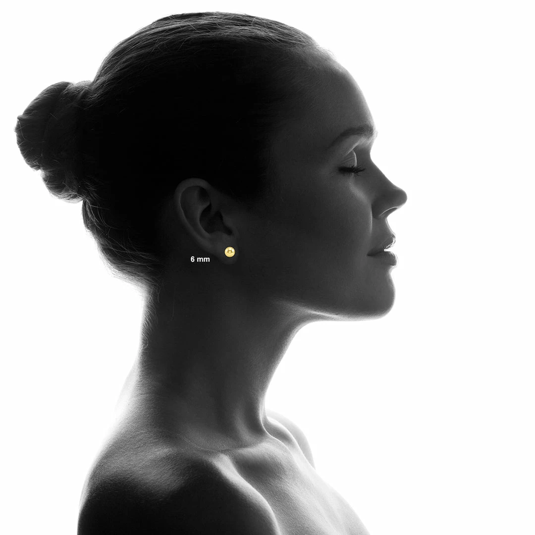A beautiful pair of 14K gold filled ball earrings measuring 6mm in diameter. A great pair of everyday wear gold ball earrings. The earrings secure on push back posts. Simple, clean and classic!Gold filled jewelry consists of a layer of gold bonded to the underlying base metal. Unlike gold plating, gold filled jewelry is crafted with gold that constitutes at least 5% of the total item weight and will not fade or tarnish like plated jewelry often can. It can withstand heat and water over time. These 14K gold filled ball earrings are great quality and perfect for everyday wear.