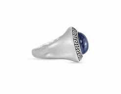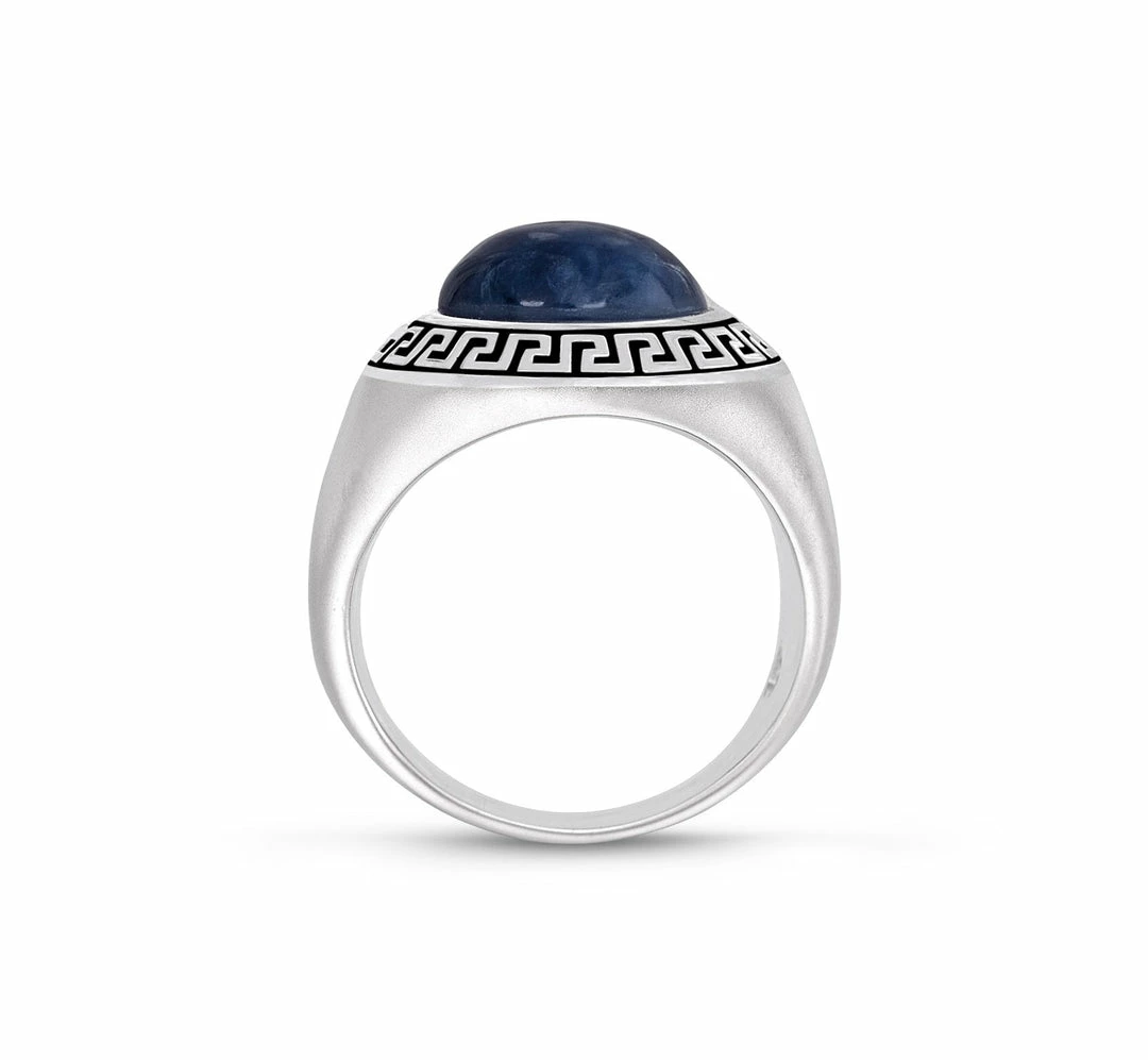 Crafted in 925 Sterling Silver, this classy ring features a blue apatite stone encircled by a ring of continuous Byzantine-inspired symbols. Black rhodium is used to give a dark grey glimmering finish to these Byzantine-inspired symbols.